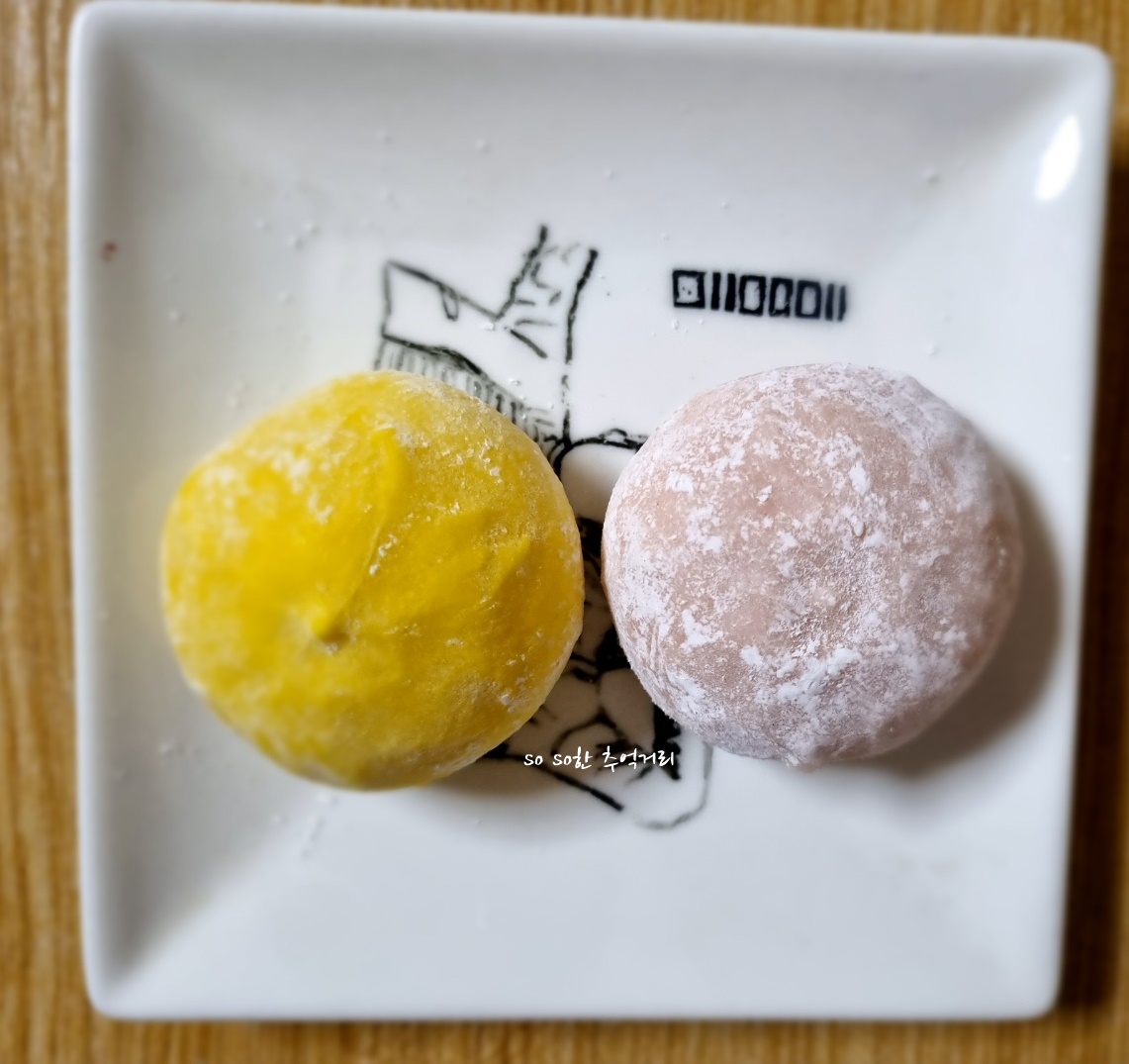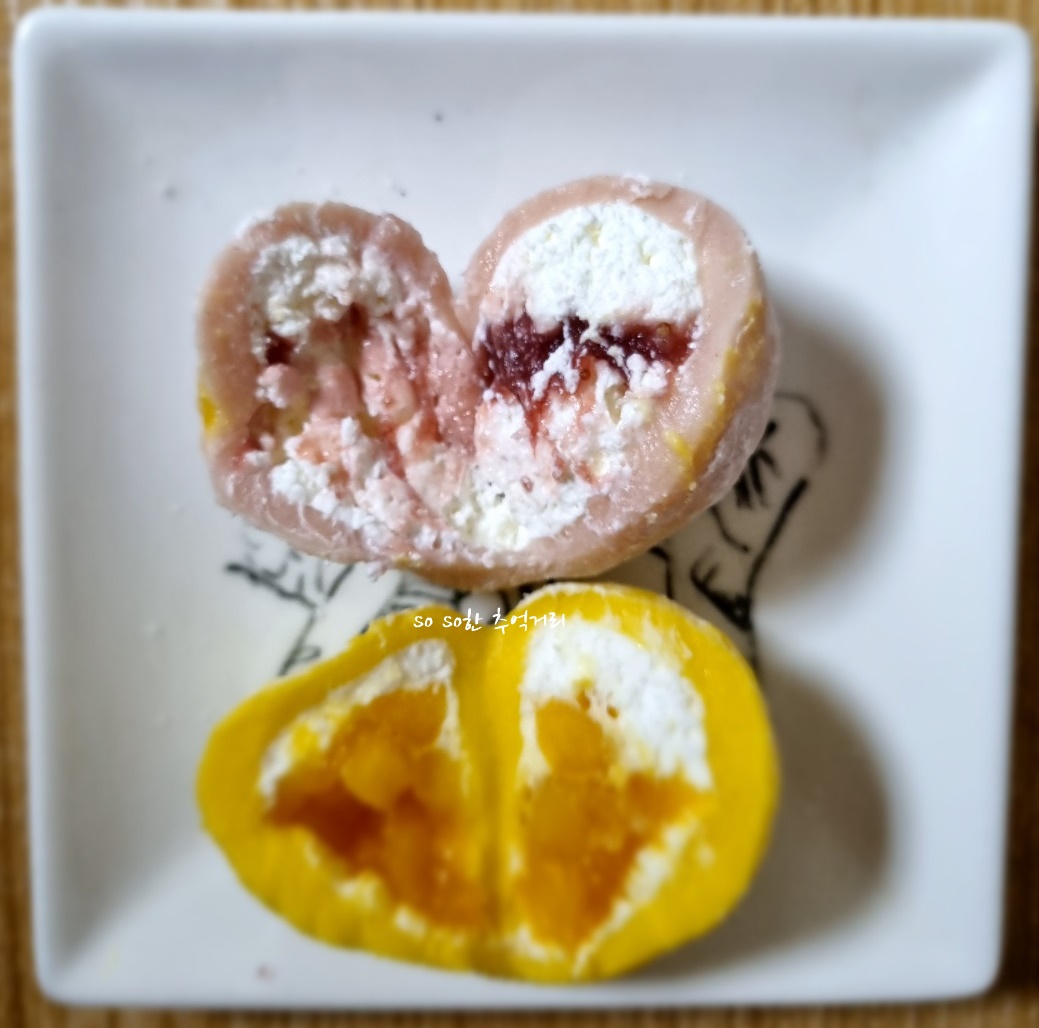 꺼내서 접시에 담아 봤다. 크기는 옛날에 먹던 찹쌀떡과 비슷한 크기다. 확실히 망고색이 더 컬러풀하니 예쁘다..