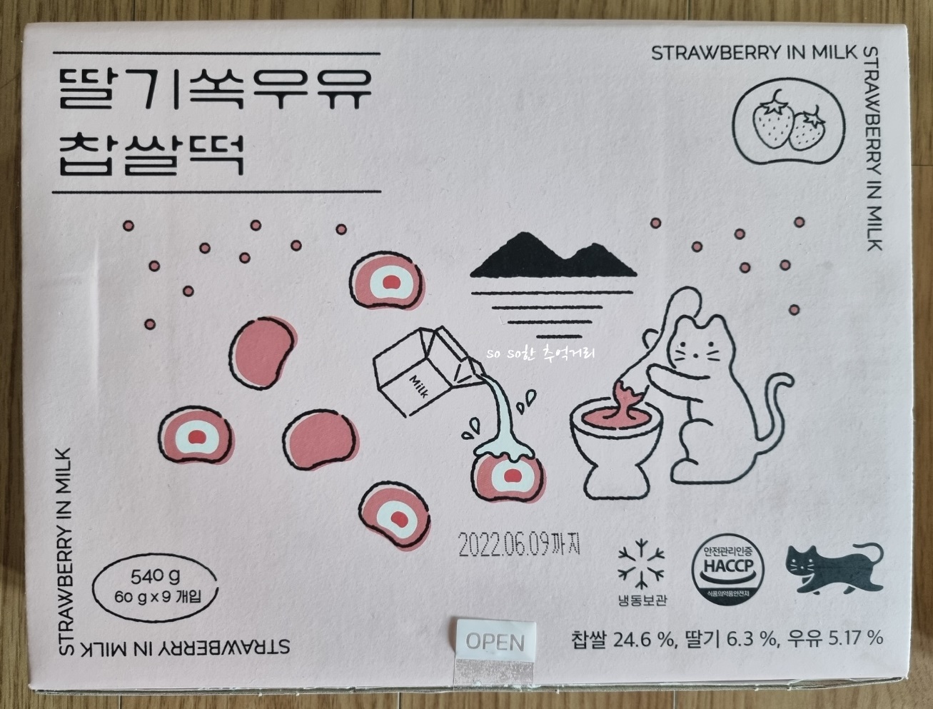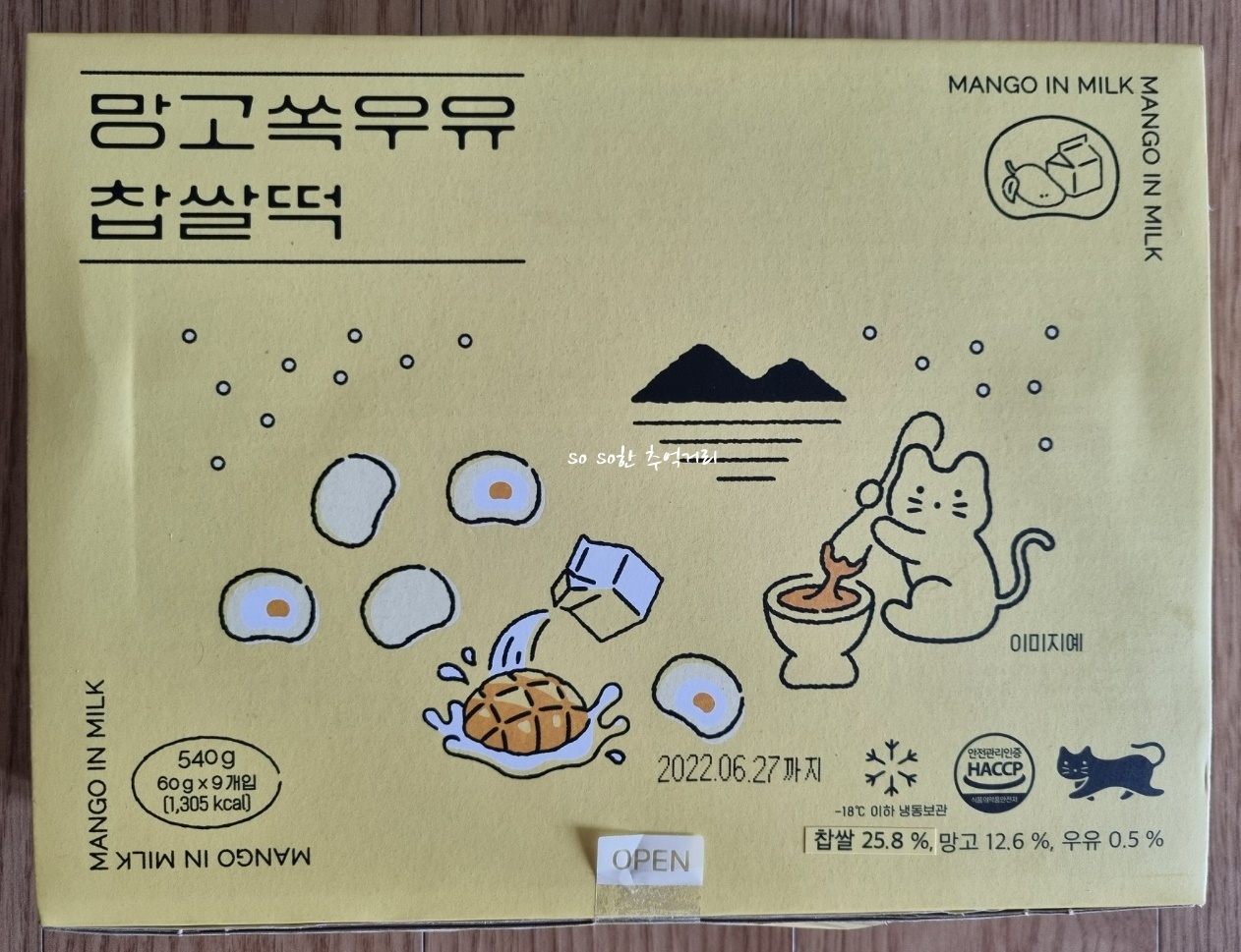 총량 총량 540g (60g×9 개입). 찹쌀 24.6%, 망고 6.3%, 우유 5.17% 가 들어있다.