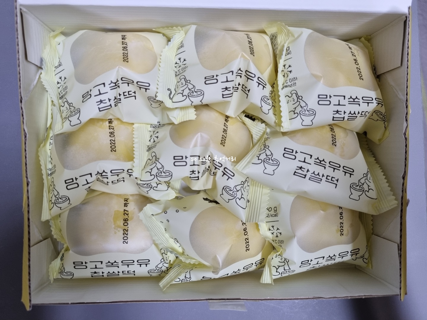 크림도 많이 못 먹듯이 이 찹쌀떡도 많이는 먹지 못한다. 한 번 먹을때 딱 1개 정도 먹을 수 있을 것 같다. 2개는 좀 쉬었다가 먹어야 함 ㅎ ㅎ .. 맛은 약간 달다. 망고맛과 딸기맛 중에는 우리 식구 모두 망고맛이 더 맛있다고 했다. 망고쏙우유찹쌀떡이 딸기쏙우유찹쌀떡보다는 크림이 조금 덜 들어있어서인지 전체적으로 맛의 조화가 더 좋았다.