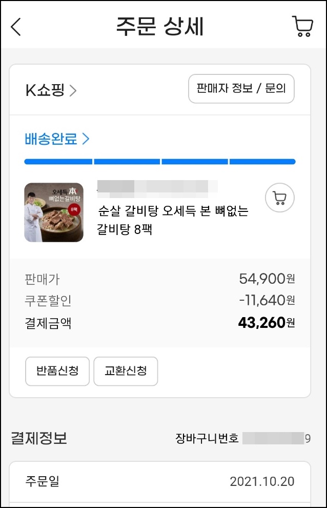 홈쇼핑 갈비탕 추천 오세득 본 뼈없는 갈비탕을 지마켓에서 주문했지만 K쇼핑이라는 홈쇼핑에서 판매하는 상품이다. 가격이 8팩에 54,900원인데 할인해서 52,160원 또 쿠폰할인해서 43,260원에 구입했다. 한팩당 5,400원 정도 한다.