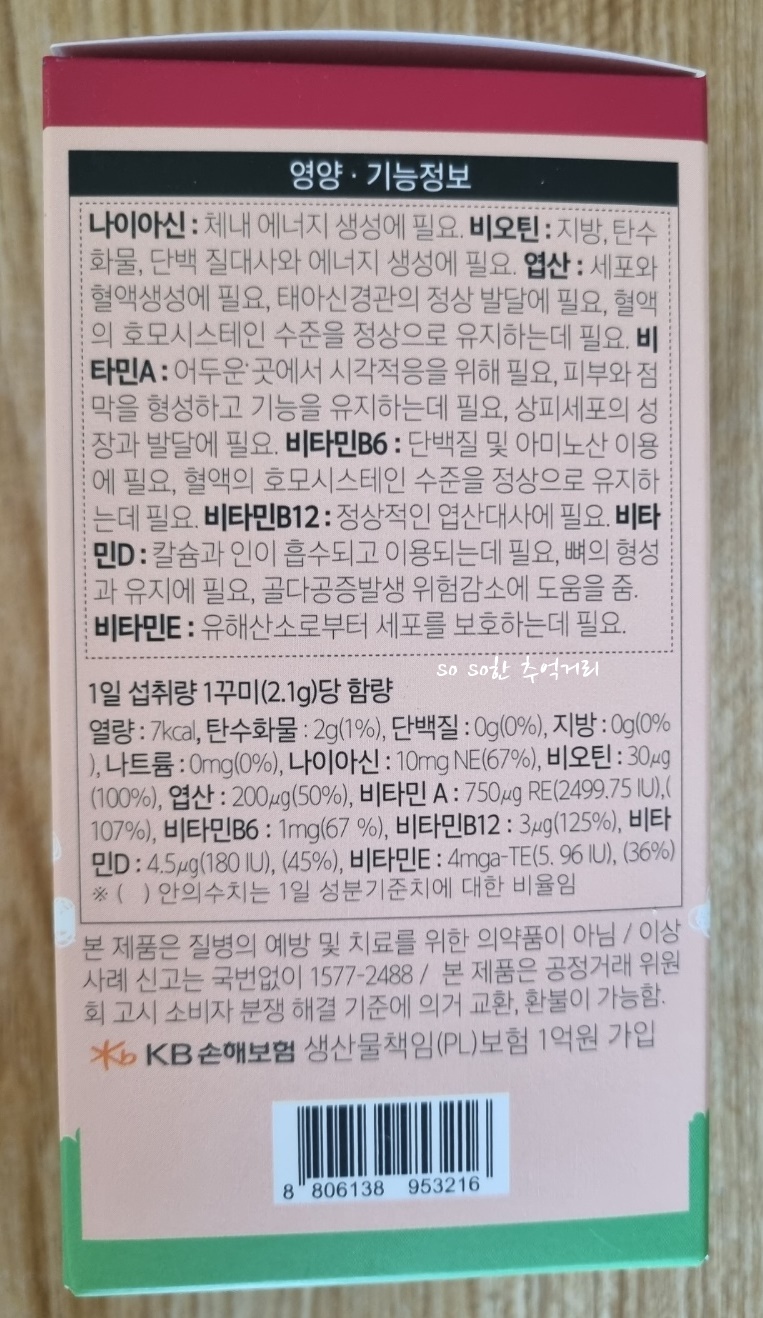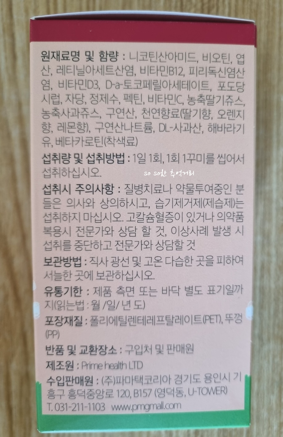원재료 및 함량 : 니코틴산아미드, 비오틴, 엽산, 레티닐아세트산염, 피리독신염산염, 비타민B12, 비타민D3, D-a-토코페릴아세테이트, 포도당시럽, 자당, 정제수, 펙틴, 비타민C, 농축딸기쥬스, 농축사과쥬스, 구연산, 천연향료(딸기향, 오렌지향, 레몬향), 구연산나트륨, DL-사과산, 해바라기유, 베타카로틴(착색료)