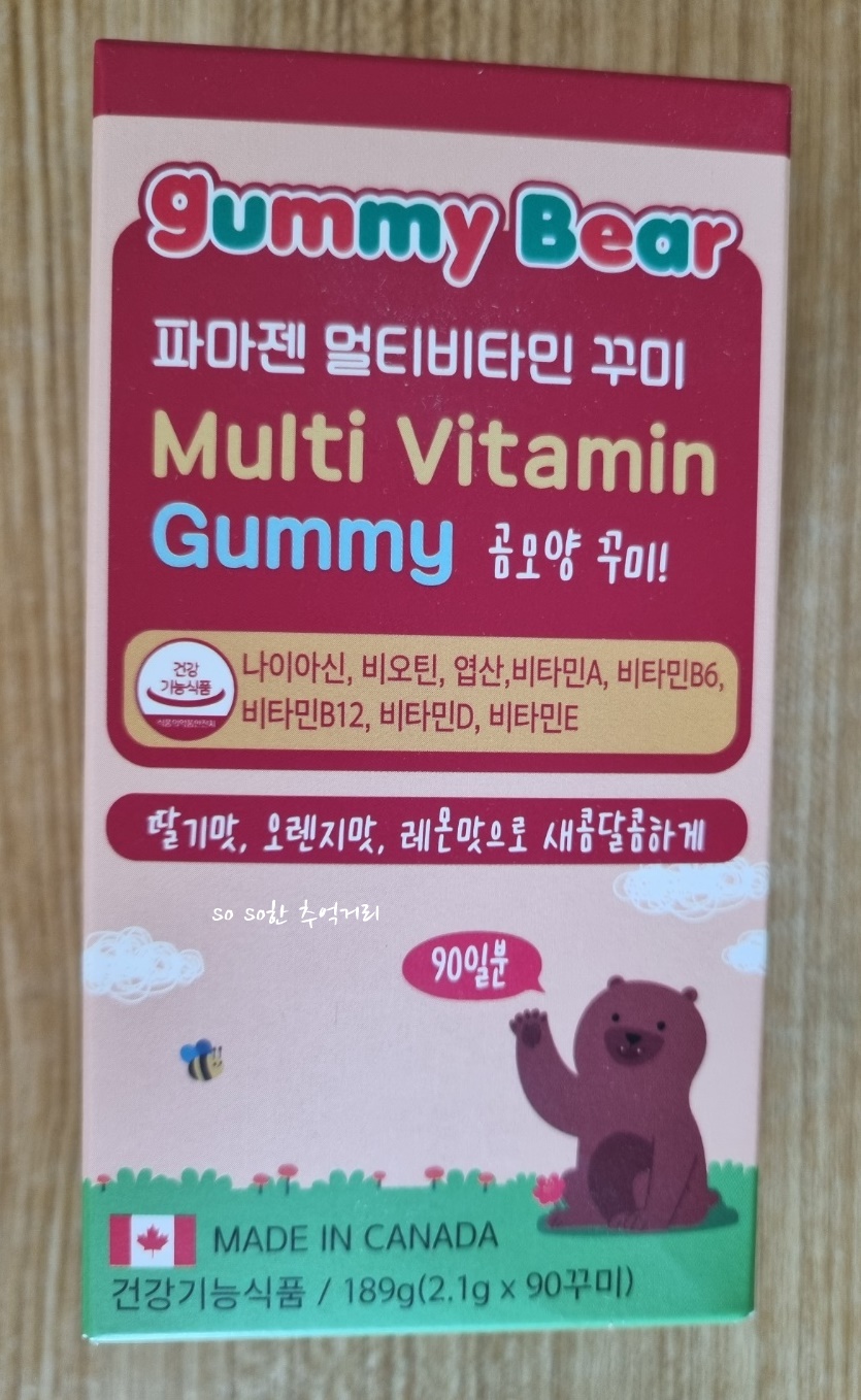 어린이 비타민 영양제 파마젠 멀티비타민 꾸미(젤리)는 캐나다산이다. 중량 189g 에 90꾸미가 들어있다. 하루에 1정 먹으면 딱 90일분이다.