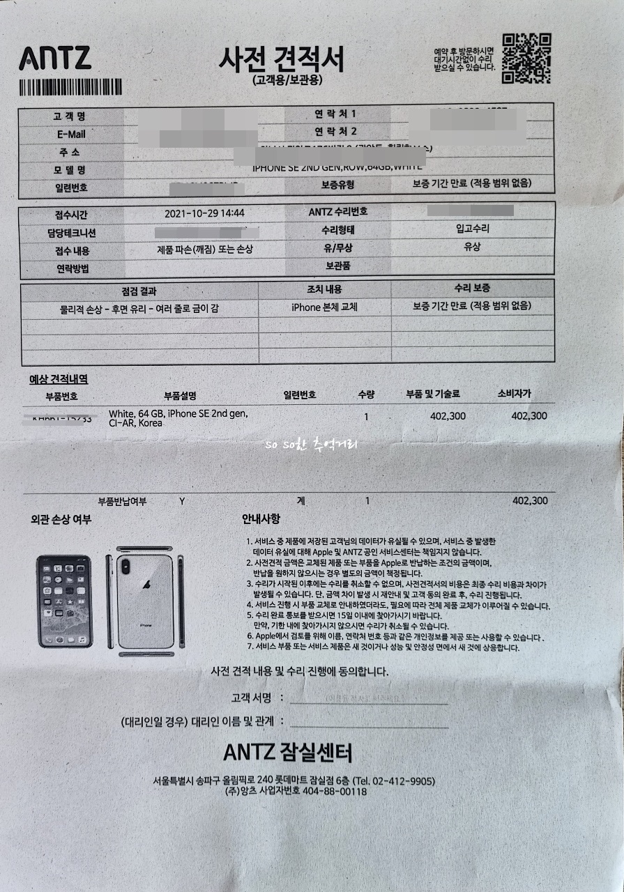 약 30분 정도 기다렸을까~ 순서가 되어서 상담을 받았다. 물론 아들 아이폰은 깨져서 수리가 안되었다. 보상문제를 얘기했더니 교체하는 방법 밖에 없어서 일단 사전견적서를 주기로 하셨다. 견적서는 한번밖에 못 주신다고 관리를 잘 하라고 하셨다. 보상이 얼마나 나올지 모르지만 그 때 봐서 수리를 하던지 폰을 바꾸던지 해야 겠다. 역시 아이폰 수리비는 비쌌다. 40만원 넘었다. ㅠ ㅠ 난 견적서를 가지고 왔지만 옆에 고객분을 보닌까 맥북수리인데 한시간 정도 소요가 된다는 얘기를 들었던 것 같다. 당일 수리가 가능하다.