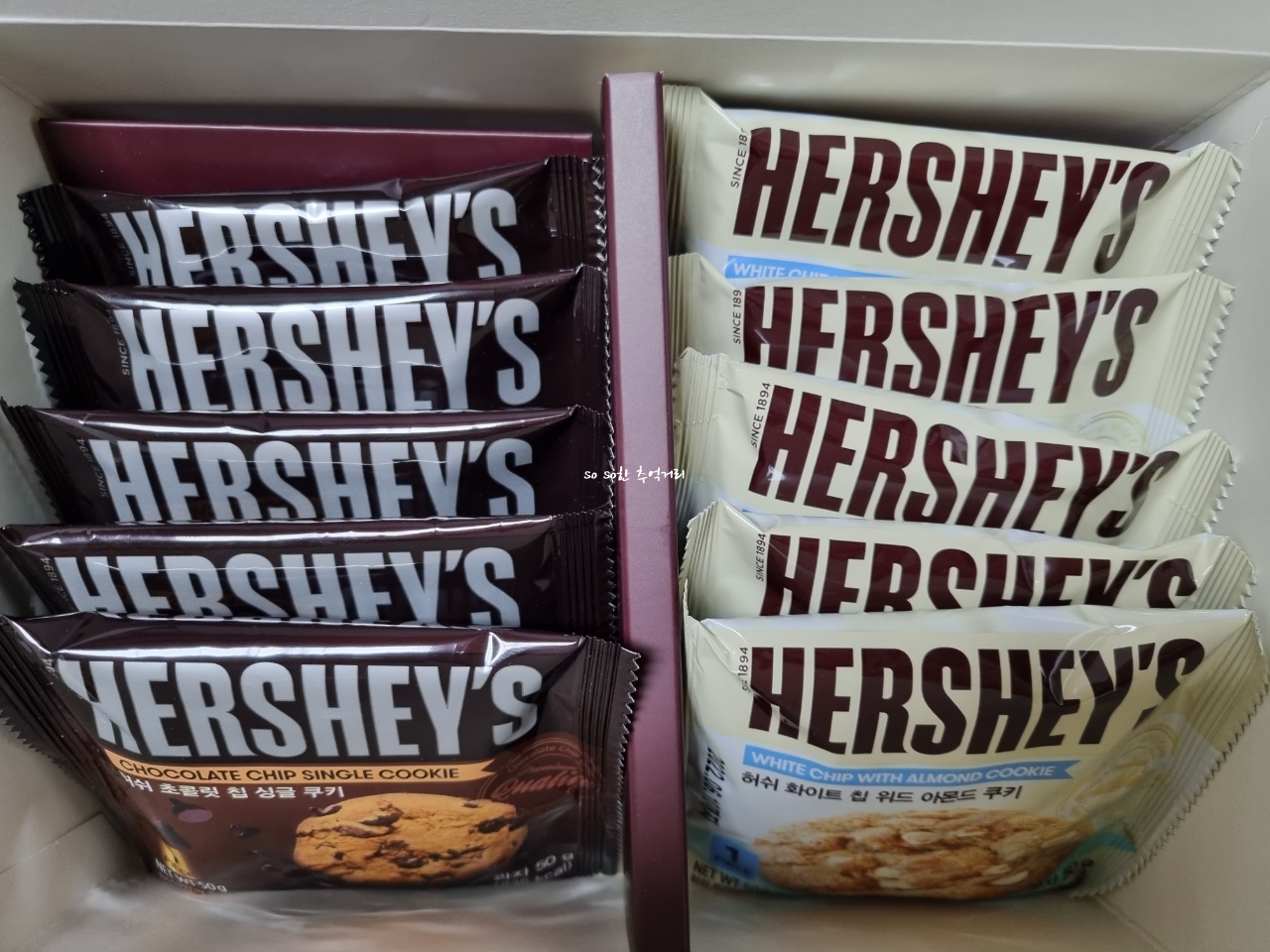 수험생 선물 허쉬 쿠키 버라이어티 팩은 두가지 맛이 있다. 허쉬 초콜렛 칩 싱글 쿠키와 허쉬 화이트 칩 위드 아몬드 쿠키 맛이 들어 있다. 총 10봉지가 들어 있다.