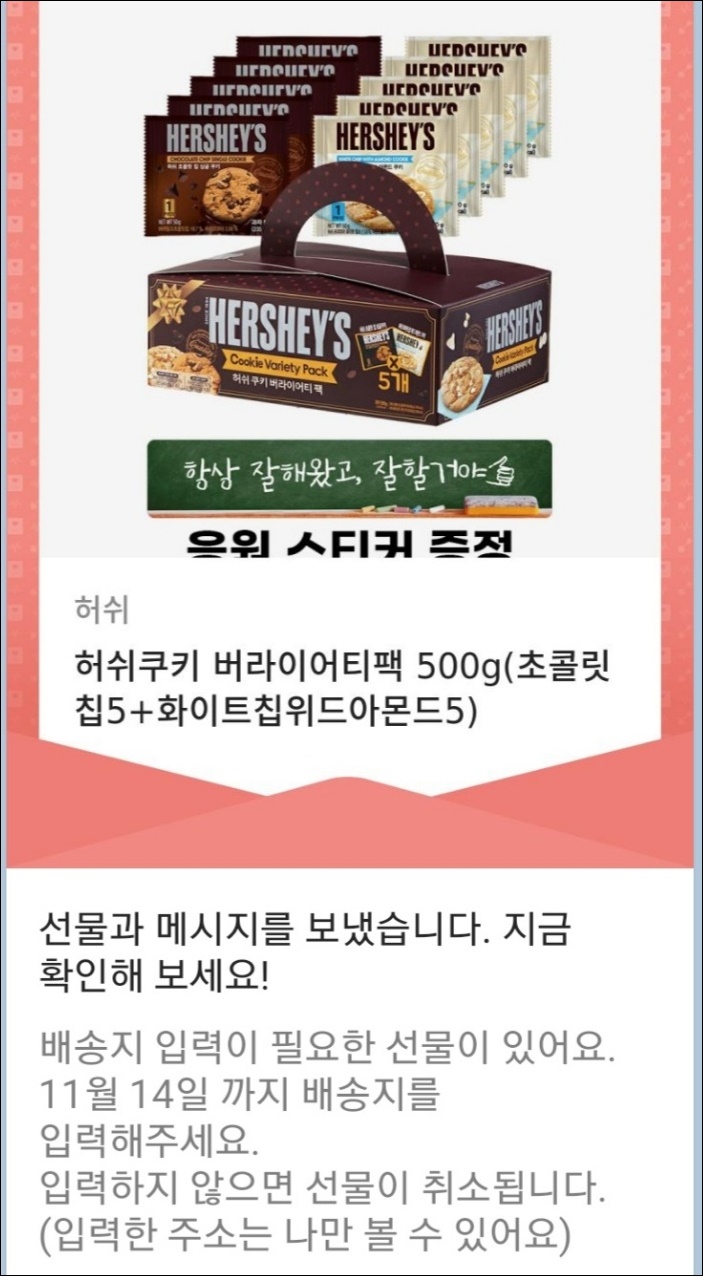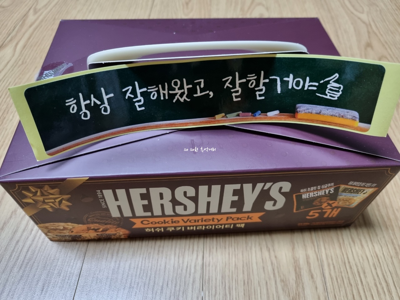 수능일( 2021. 11. 18)이 다가오자 고3 수험생인 딸에게 선물이 하나씩 하나씩 도착한다. 이번에도 조카가 보내준 수험생 선물 허쉬 쿠키 버라이어티팩이다. 참고로 난 조카가 많다. 예전에는 내가 사주었는데 이제는 조카들이 내 딸에게 사준다. 그 조카들의 나이가 벌써 30대를 향하고 있다. 서로 메세지를 나누면서 세월이 빠르다고 얘기했다. 알고보니 그 애기 였던 조카도 나랑 같이 늙어가고 있다.