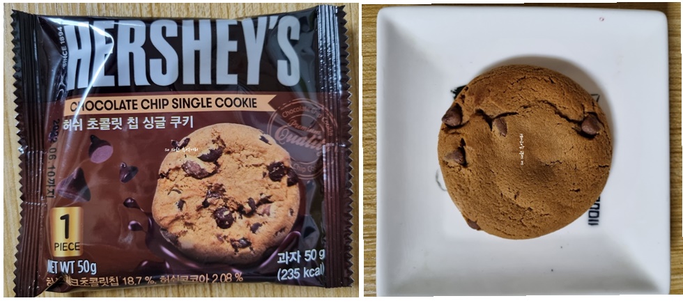 허쉬 초콜릿 칩 싱글 쿠키는 중량 50g, 235kcal 이다. 쿠키 안에는 초콜릿이 들어 있다. 겉 봉지를 보았을때는 바삭할 거라고 생각했는데 쿠키는 바삭하지 않고 촉촉한 느낌이다.