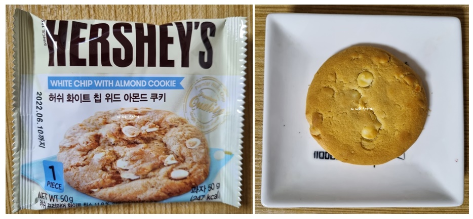 수험생 선물 허쉬 화이트 칩 위드 아몬드 쿠키다. 중량은 50g, 247kcal이다. 아몬드가 들어 있어서인지 초콜릿보다 더 칼로리가 높다. 특히 겉봉지 보면 초콜릿 보다 더 바삭하게 생겼다. 봉지에 있는 이미지와는 조금 다른 내용물이다. 이것도 느낌은 딱딱한 쿠키가 아니라 촉촉한 타입의 쿠키다.