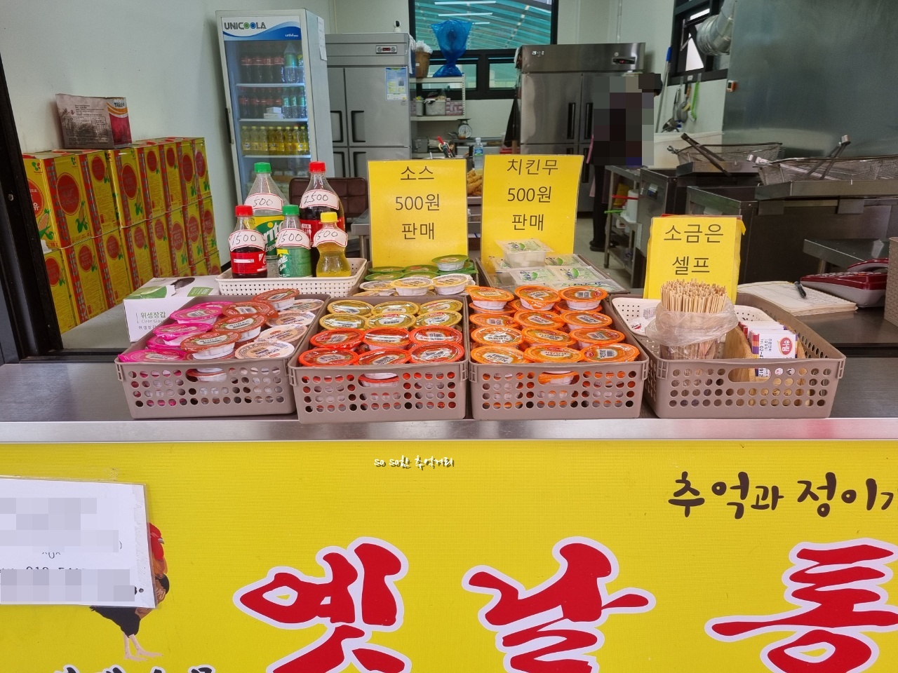 하남 감일 옛날통닭은 닭 한마리에 6,500원 두마리에 12,000원이다. 여기에 필요한 음료수, 소스, 치킨무 등을 같이 살 수 있다.