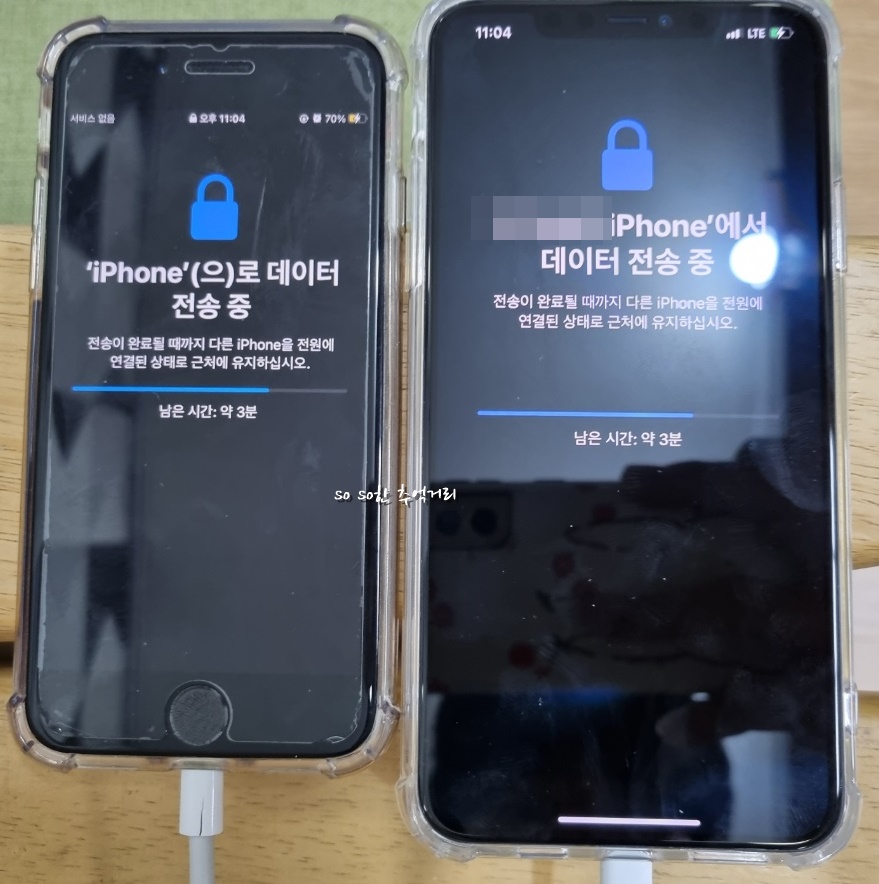 전에 아들이 쓰던 아이폰 SE2와 아이폰11프로맥스 제품이다. 테이터를 옮기는 중이다. 확실히 크기가 차이가 많이 나는데 베젤도 없어서 더 크게 느껴진다. 그래서인지 무겁긴 하다.