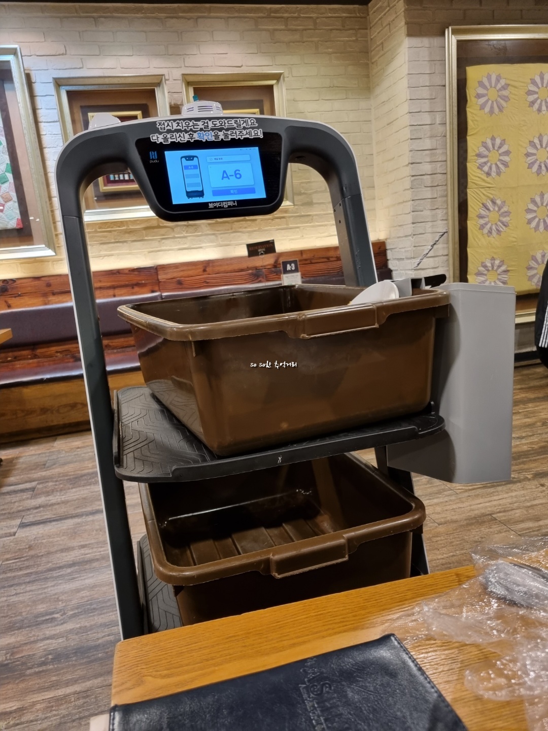 테이블에 있는 벨을 누르면 푸드봇이 도착한다. 이곳에 다 먹은 접시를 넣고 확인을 누르면 원래 있던 장소로 간다. 아들이 하는 말이 알바생도 없는데 왜 돈은 더 비싸지냐고 되묻는다. 일은 로봇이하는데 말이다.
