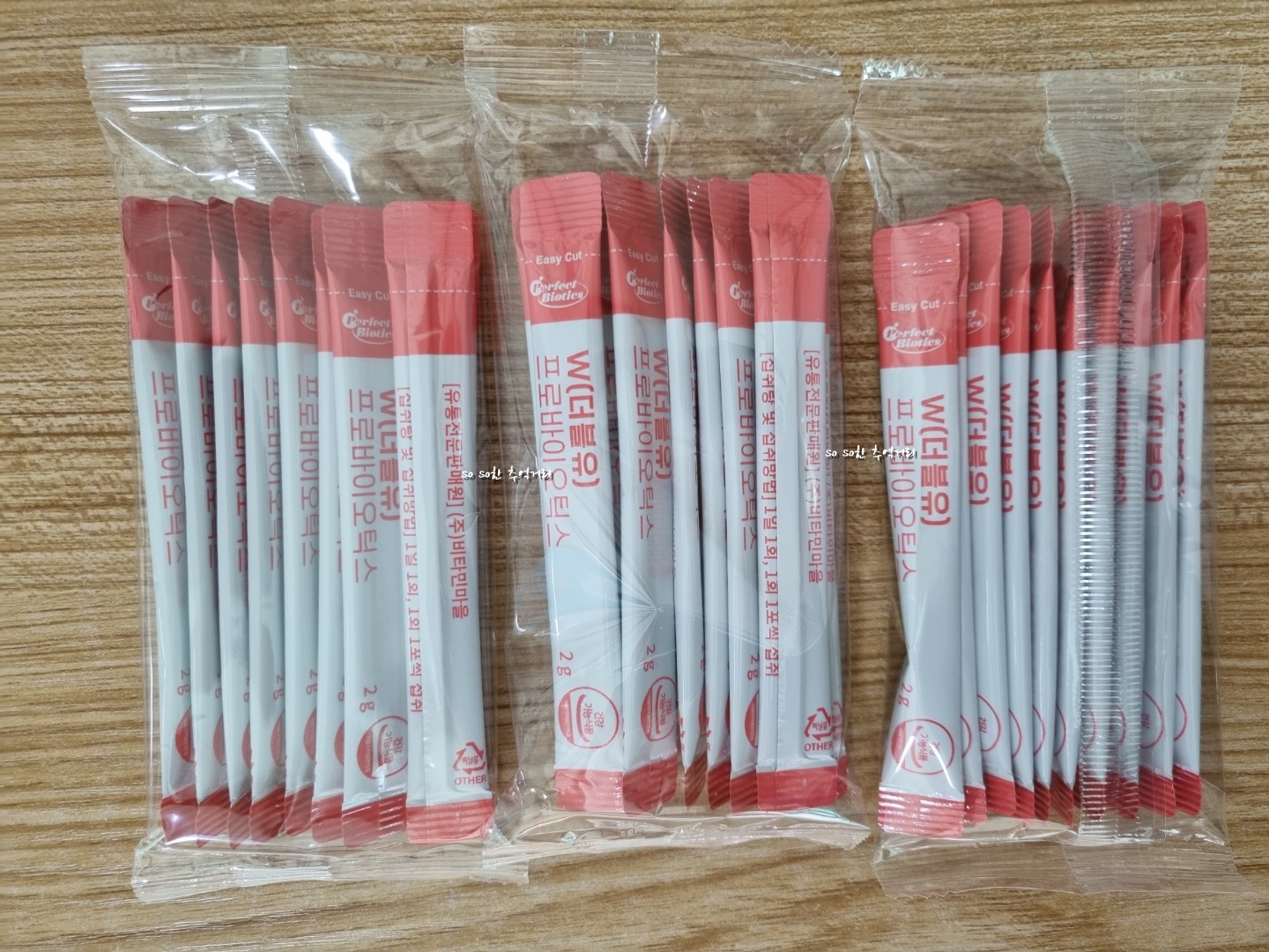 질유산균 추천 더블유 프로바이오틱스를 한봉지 뜯어서 숟가락에 부었다. 색은 정말 하얀 백색이다. 1포에 2g이 들어있다. 맛은 요쿠르트 맛이라 첫맛은 새콤하고 끝맛은 달콤한 맛이 난다. 우리가 평소에 장을 위한 유산균과 비슷하다. 회사마다 다르지만 그래도 먹기에 부담은 없다. 근데 단점이 1포를 뜯을때 절취선은 만들어 놓았지만 손으로는 절대 안 뜯어진다. 가위를 사용해야 한다는 단점이 있다.