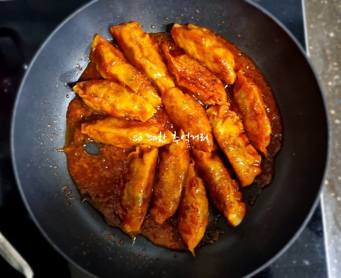 잘 구워진 만두위에 양념소스를 넣은후 잘 뒤집어 주면서 양념을 골고루 묻혀준다. 양념이 잘 베도록 약불에서 천천히 조려준다. 그럼 만두강정이 다 완성이 된다.
