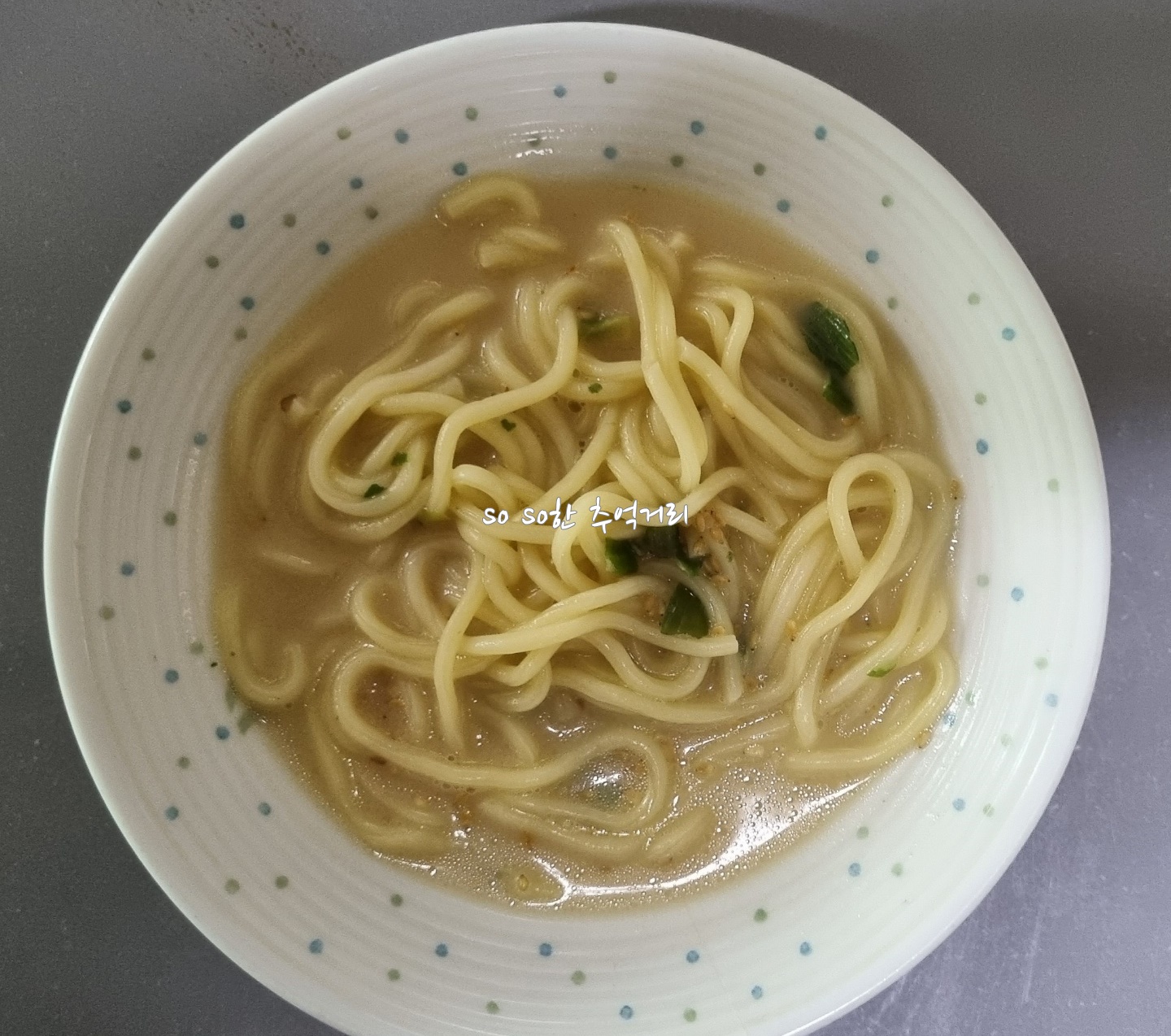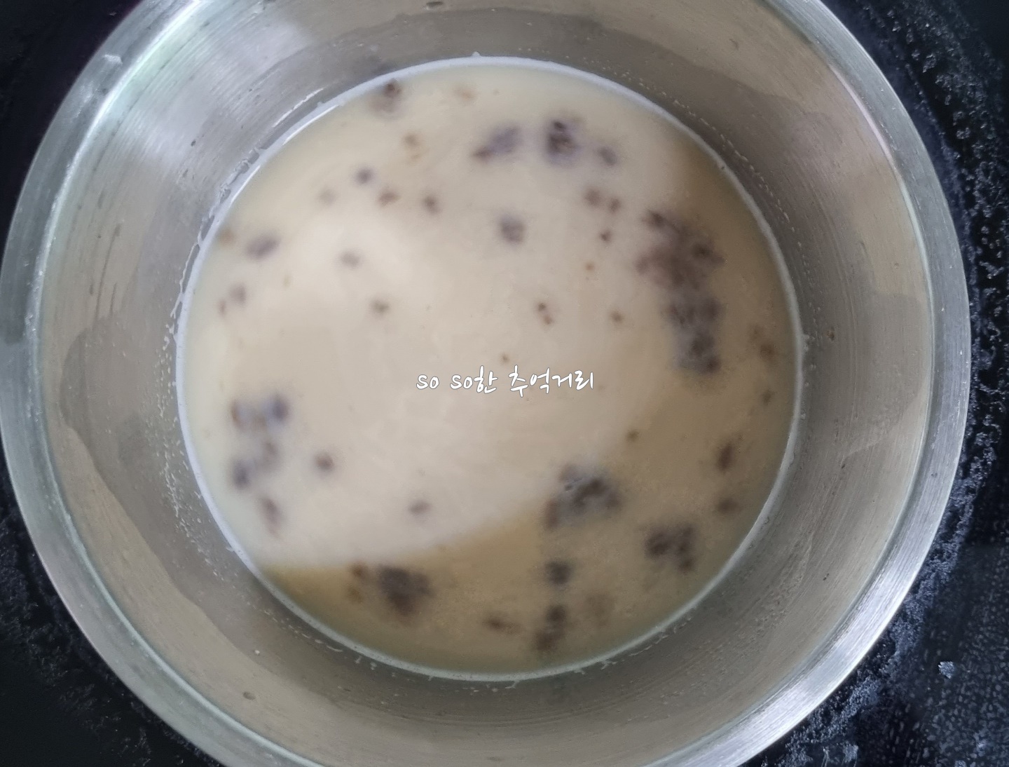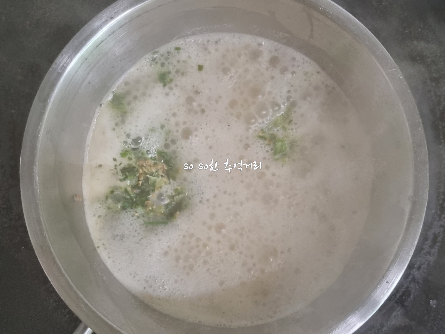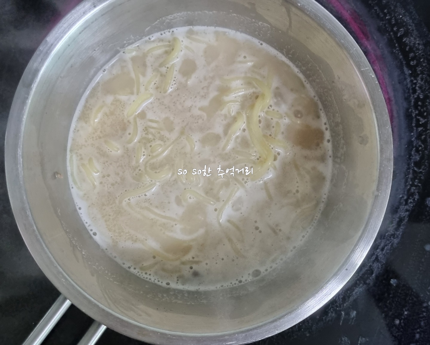 쇠고기 건더기와 고기국수소스를 잘 저어주면 이렇게 뽀얀 국물이 된다.