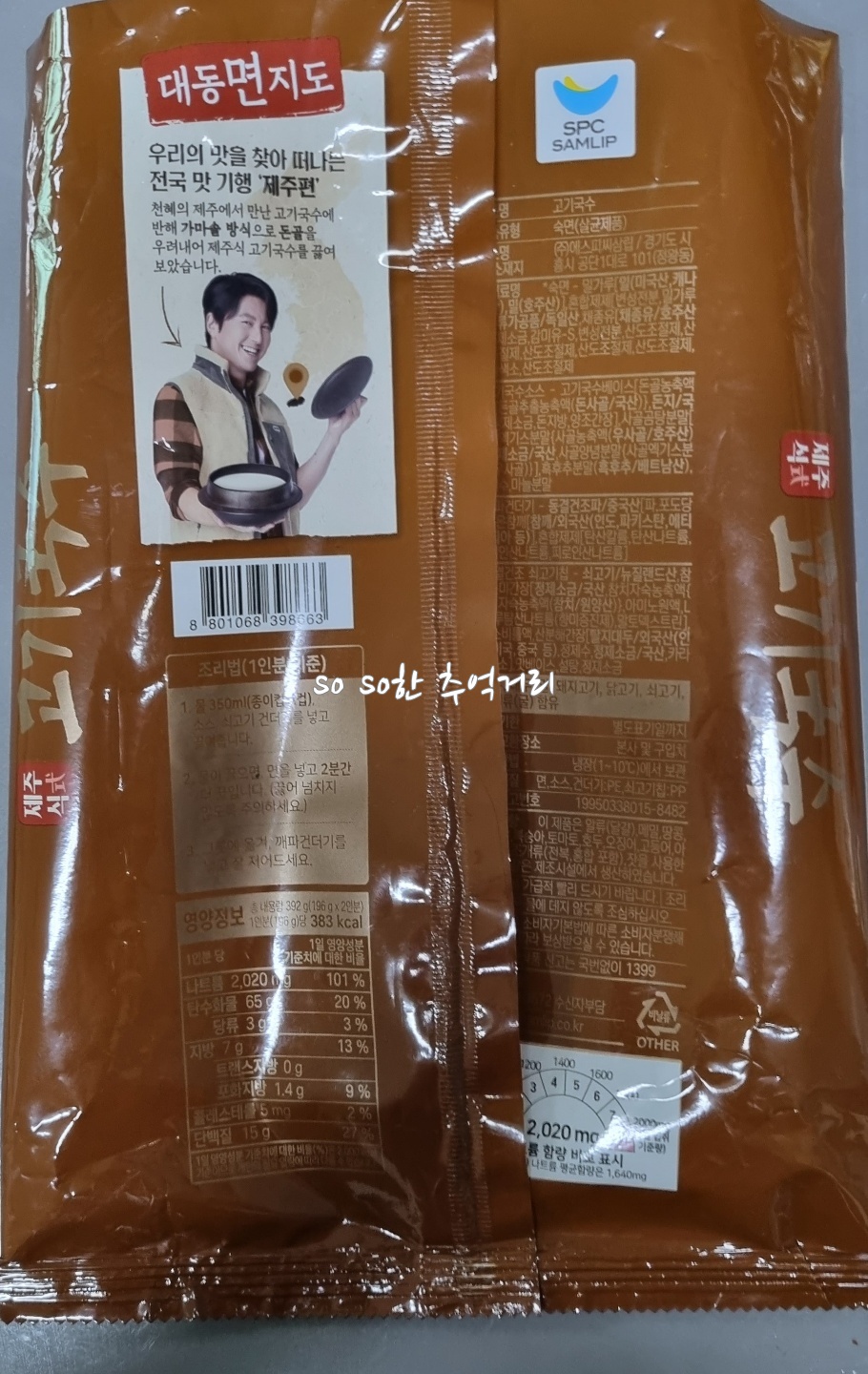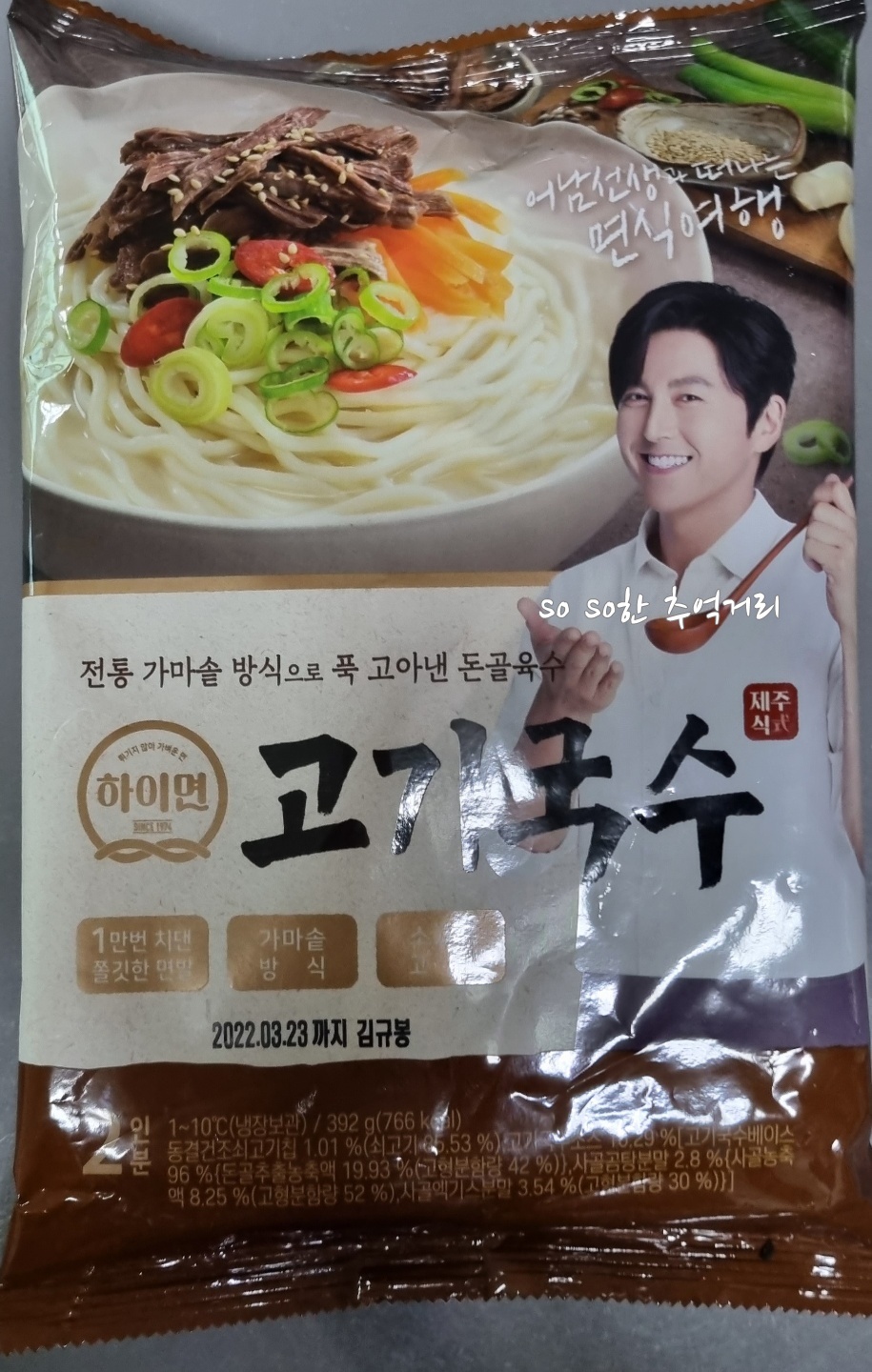 하이면 고기국수는 2인분이 들어있다. 총 내용량은 392g, 2인분 열량은 766kcal다.