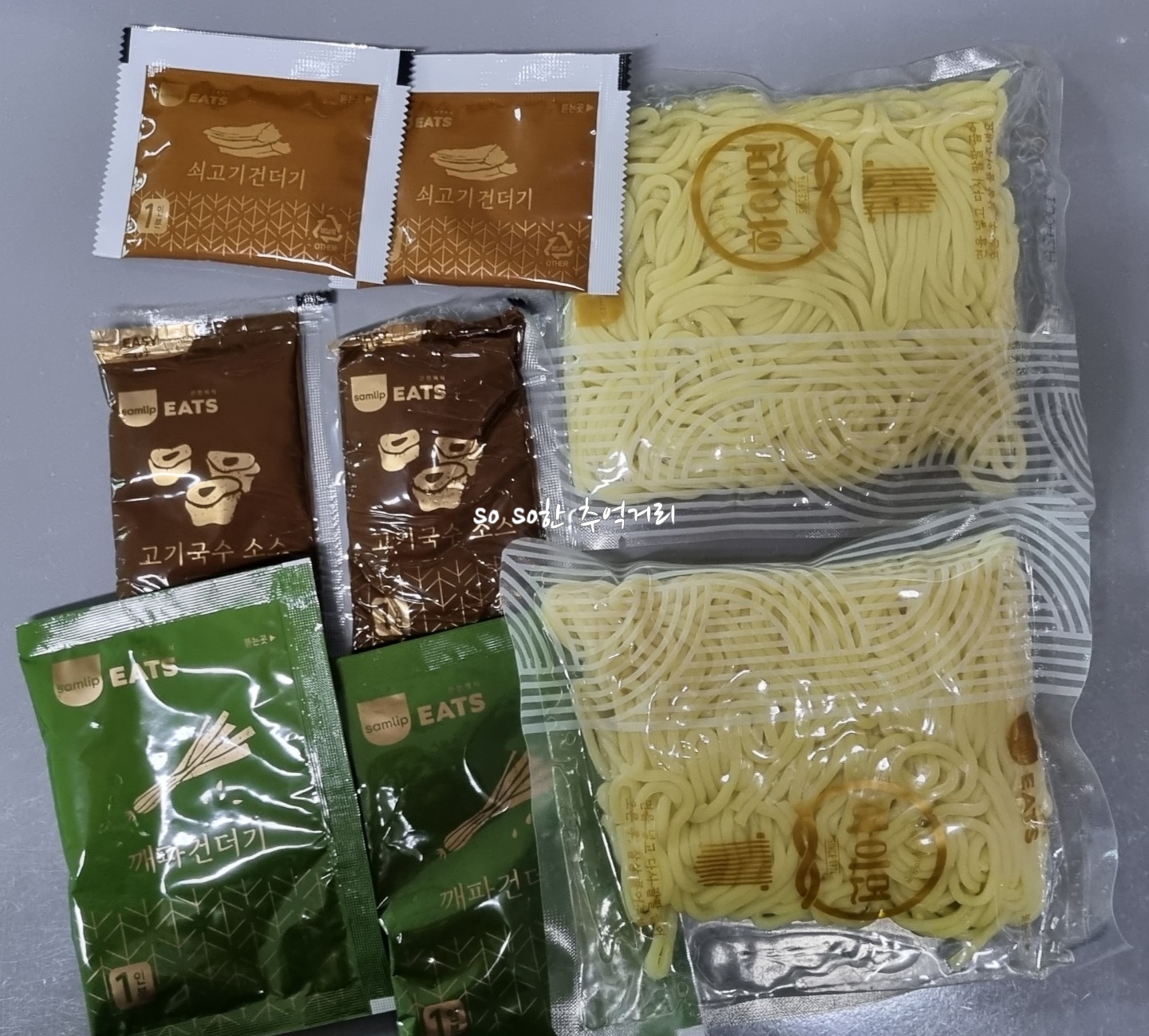 내용물은 2인분용 면과 쇠고기건더기, 깨파건더기와 고기국수 소스가 들어 있었다.