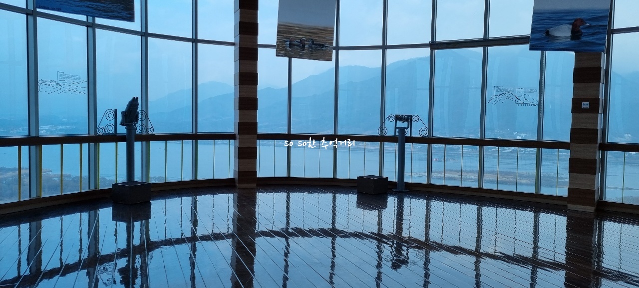 유리 넘어로 본 전경이다. 하얀색은 고니떼이다. 망원경으로 보면 자세히 보였다.