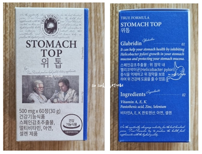 위에 좋은(위축성 위염, 역류성 식도위염) 영양제 위톱 한번 꾸준히 먹어 보려한다. 특히 위축성 위염은 약이 없다. 위축성 위염은 위암에 걸릴 확률이 6배가 더 높다고 한걸 언젠가 TV에서 본 것 같다. 난 위축성위염과 역류성 식도위염이 있어서 위영양제도 먹고 양배추즙도 부지런히 먹어야 할 것 같다.