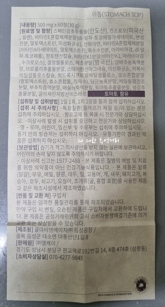 트루포뮬러 위톱은 제조원이 콜마비앤에이치(주) 판매사는 (주)엘케이다. 첨 듣는 곳이지만 워낙 광고를 많이 해서인지 아시는 분이 많이 있는 것 같다. 특히 위축성 위염은 위 점막이 얇아져 있는 상태인데 위점막을 보호 해줄 수 있다고 해서 구매 했다. 네이버나 지마켓 등 에서 현재 판매 되고 있는데 난 지마켓에서 무료배송과 쿠폰을 이용해서 30,230원으로 구매했다.