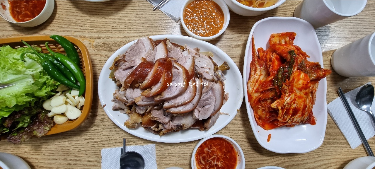 족발 반마리가 생각보다 양이 많았다. 지인은 이곳 말고 다른곳에 가면 확실히 양이 작다고 한다. 사실 난 족발을 많이 먹어보지를 않아서 양을 정확히 알지 못한다. 그래도 내가 볼 때에도 가격대비 양이 작아 보이지는 않았다. 돼지고기 냄새에 예민한 나로써는 조금 걱정했지만 다행히 족발에 냄새가 나지 않았다. 고기도 쫄깃하고 부드러웠다. 김치도 맛있었다.