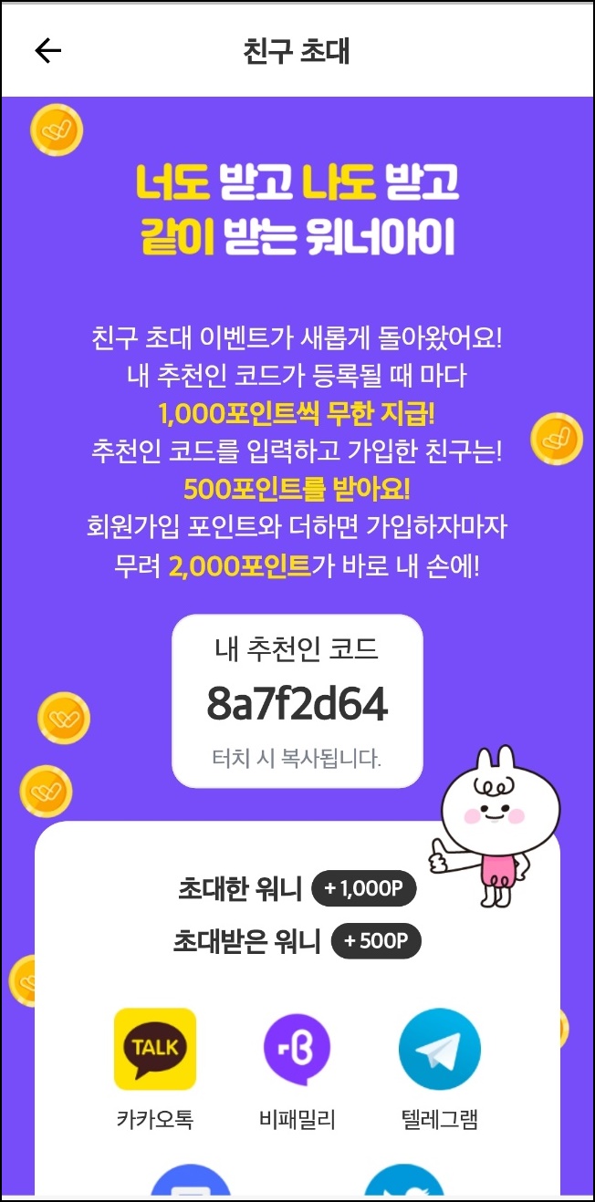 워너아이추천인 8a7f2d64 를 넣으면 바로 2천원 적립이 된다..