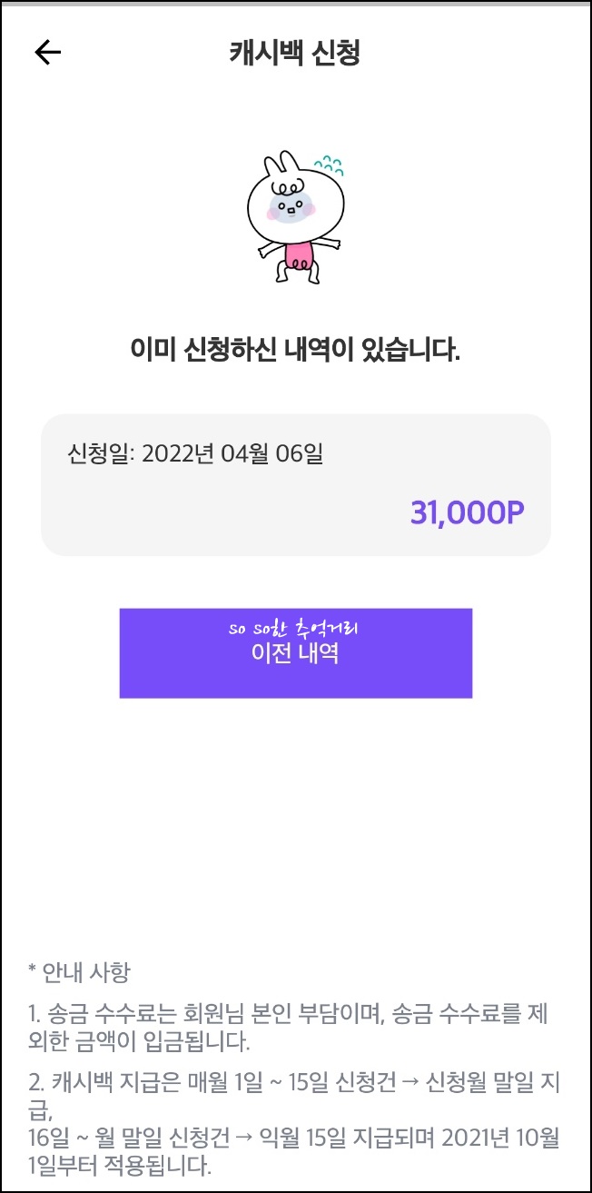 워너아이포인트는 캐시백 즉 현금으로도 출금된다는 장점이 있다. 3만원 넘으면 신청이 가능하다. 그래서 직접 31,000원일때 신청을 했다. 근데 바로 입금이 되는줄 알았는데 그게 아니었다. ㅎㅎ.. 4월 6일에 신청했는데 아직 안들어왔다. 워너아이 캐시백 지급은 매월 1일 ~ 15일 신청건은 신청월 말일에 지급이 되고 16일 ~월 말일 신청건은 익월 15일 지급이된다고 한다. 며칠 있으면 입금이 될 것 같다. 여하튼 워너아이포인트가 여러모로 유용한 점이 많다.