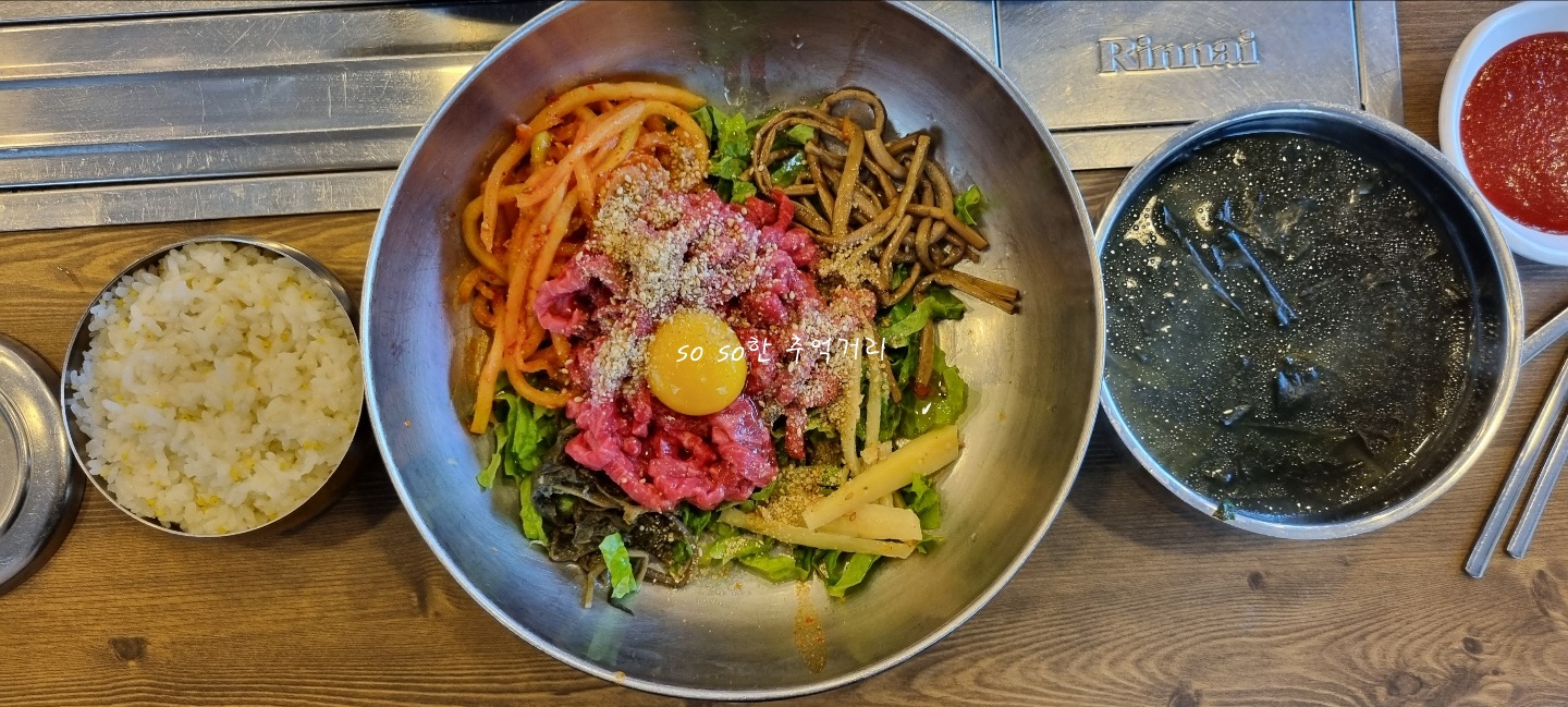 밥도 잡곡밥에 공기 가득 주셨다. 한우 육회비빔밥도 육회가 생각보다 많이 들어 있었다.
