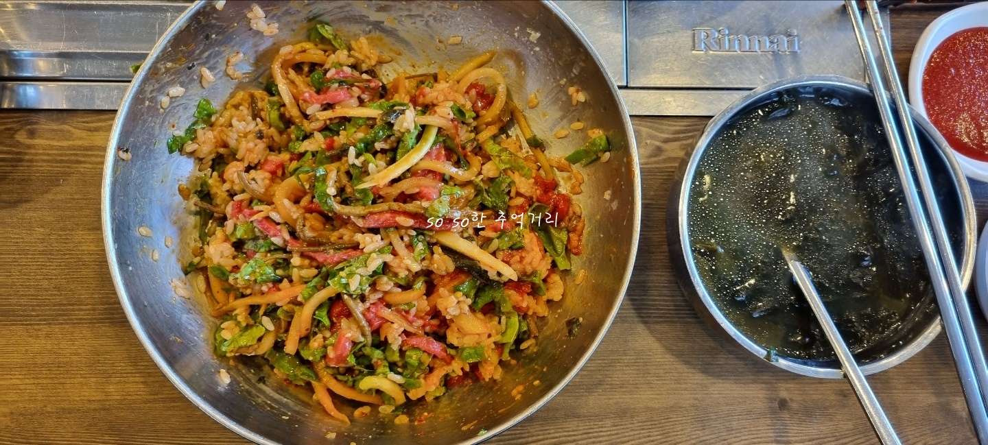 신랑이 자극적이지 않게 잘 비벼 주었다. 먹으면서 느낀건 육회가 나물 만큼 많이 들어 있다 생각했다. 육회도 너무 맛이 좋았다. 쫄깃해서 씹는 식감이 좋았다. 그리고 순한 미역국도 속이 편했다.