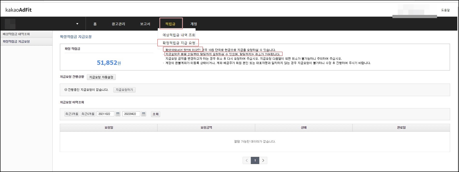 확정적립금은 5만원이상 10원 단위로 지급 요청을 할 수 있다. 카카오애드핏 지급요청 기간은 매월 21일 부터 말일까지이며 말일까지는 취소가 가능하다.