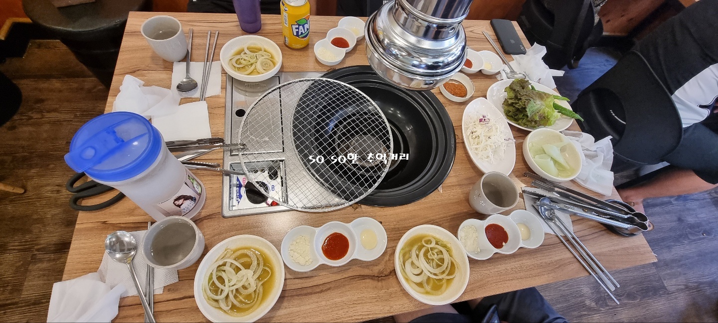 기본 세팅이다. 양파와 소스, 쌈무, 상추와 고추 그리고 샐러드까지 상차림을 해주셨다.