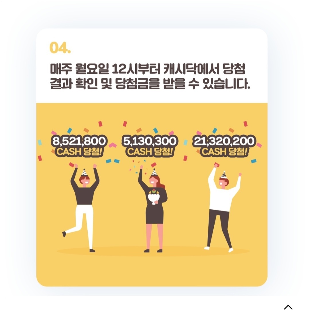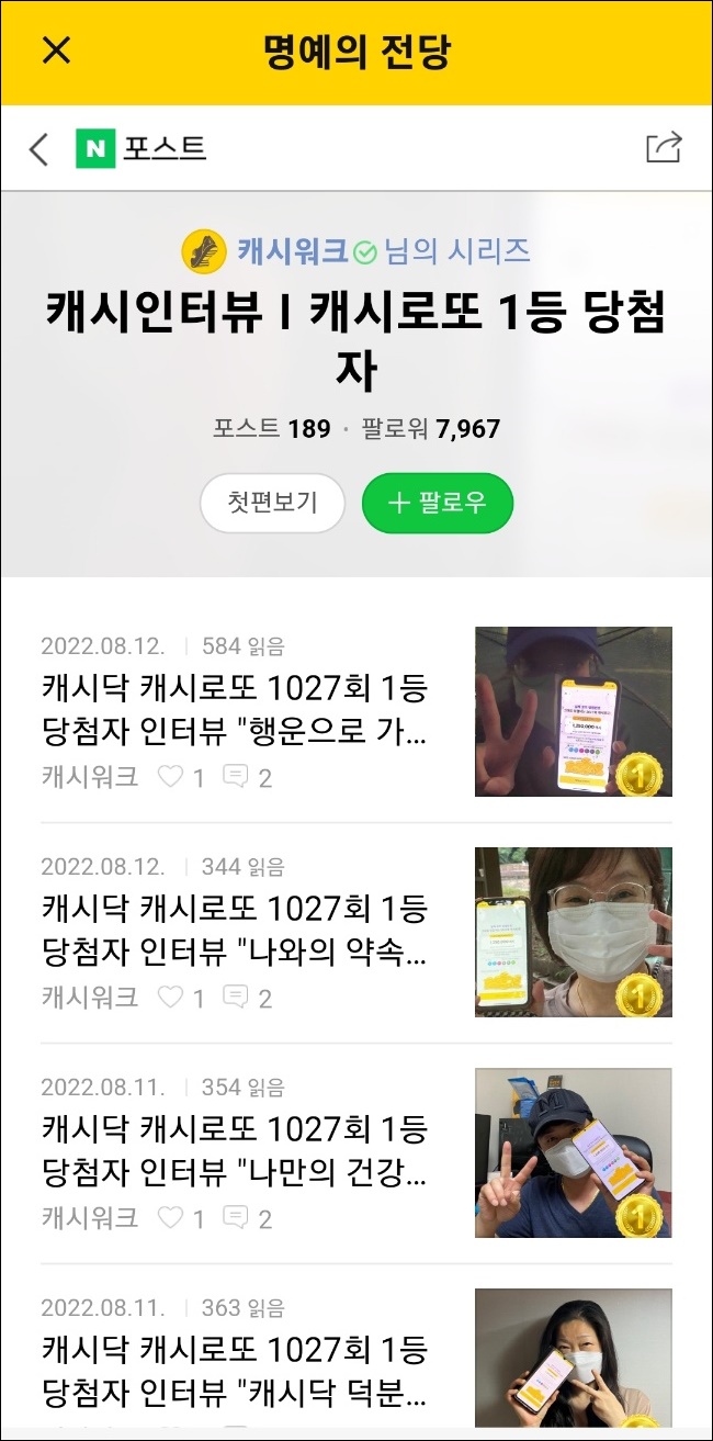실제로 당첨되신 후기글들이 굉장히 자극을 준다. 나도 열심히 걸어서 캐시로또에 당첨되면 좋겠당 ㅎㅎ