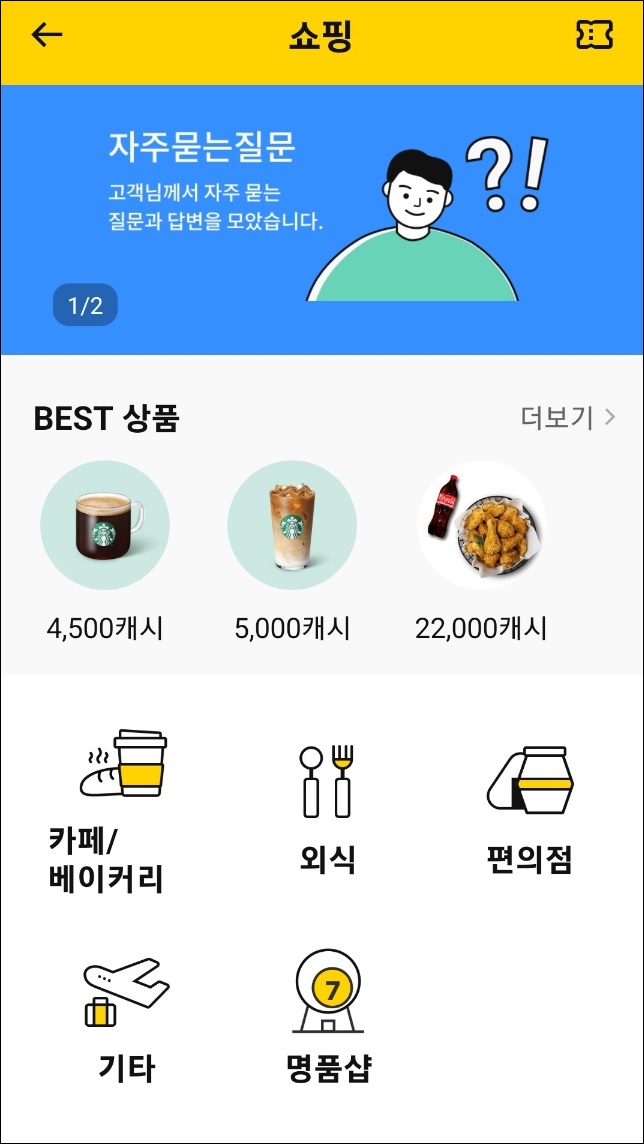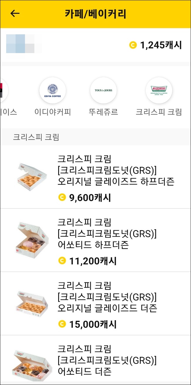 이 캐시닥 캐시로 스타벅스~ 크리스피 도넛, 그리고 명품샵까지 이용해 구매 할 수 있다.