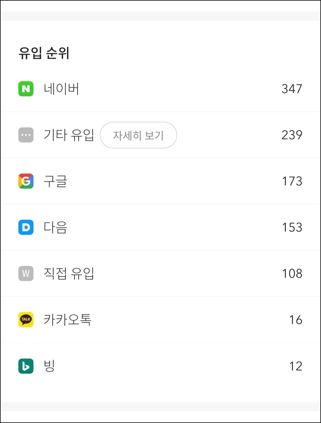그리고 네이버나 구글 유입은 시간이 약이다. 진득허게 기다리면 유입이 들어온다. 하지만 다음은 좀 실망이다. 다음은 블로그 노출에서도 네이버 블로그 글들이 다 차지 하고 이건 진짜 아니다. 이왕이면 다음에서는 티스토리가 최우선적으로 노출이 되어야 하는데 참 이건 맘에 안든다. 네이버에서는 다음이 검색이 되지도 않는데 .. 이런부분이 티스토리 운영하는데 굉장히 김 빠지는 일이다. 또 네이버애드포스트보다 카카오애드핏 광고 수익도 넘 짠것 같다. ㅠㅠ 애드센스 외에는 티스토리는 정말 맘에 안든다. 여하튼 내 생각이다.
