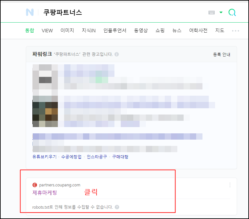 네이버에서 쿠팡파트너스를 검색한다. 그리고 빨간색 박스 제휴마케팅을 클릭한다.