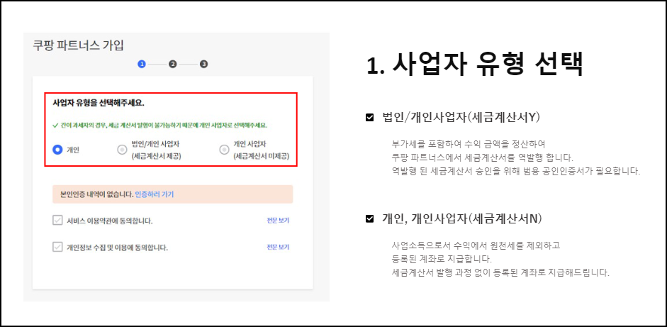 개인으로 선택한다. 법인 사업자나 개인사업자는 표시란에 체크를 한다.
