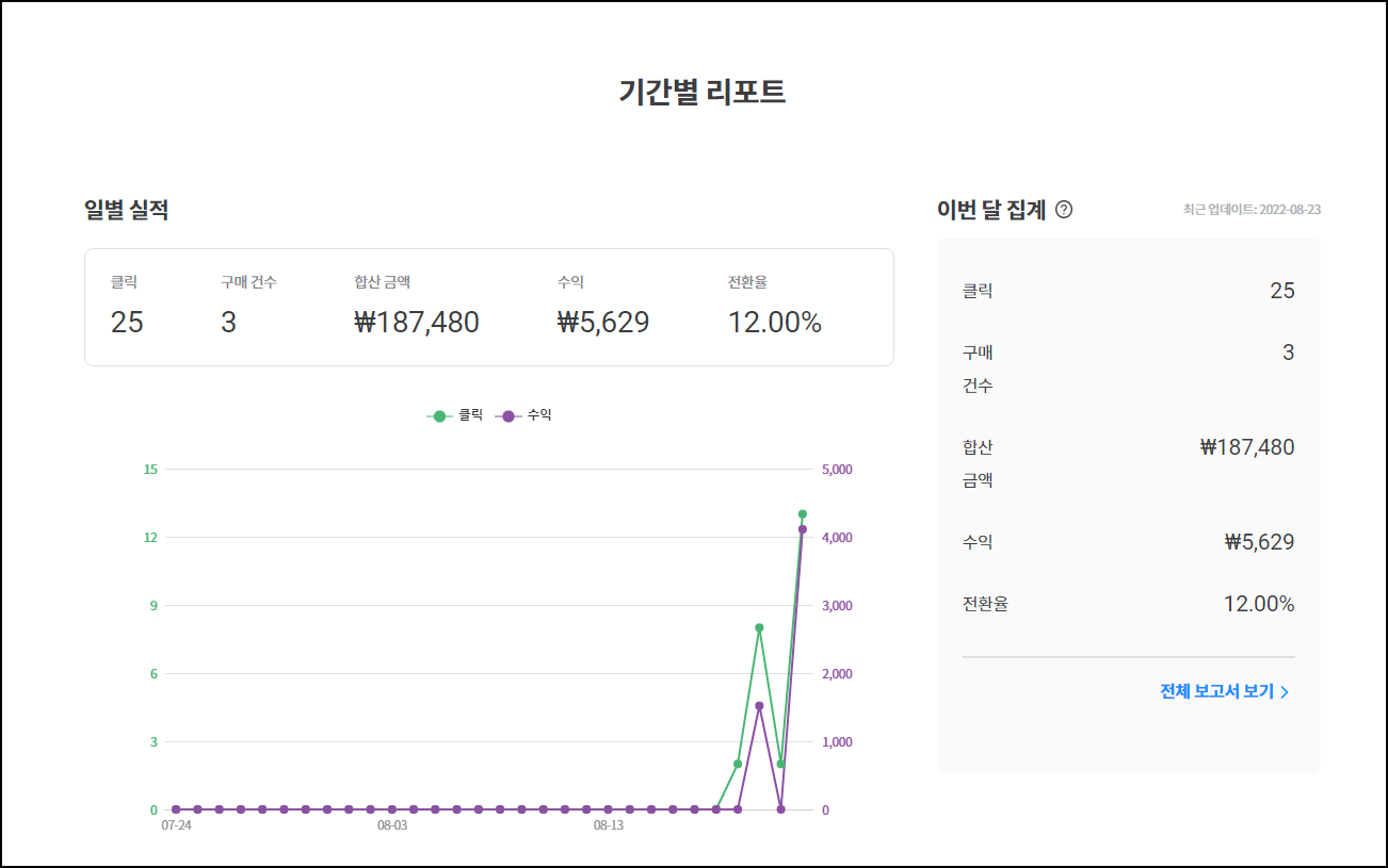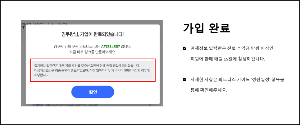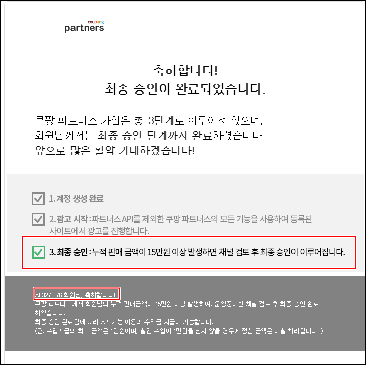 3일전에 드디어 쿠팡파트너스 추천인 코드 AF3270876 를 가입했다. 그런데 3일만에 판매금액이 15만원 이상이 되어서 최종 승인이 되었다.