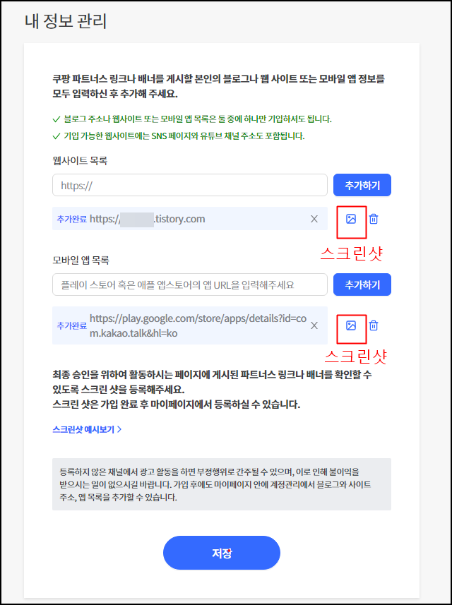 그리고 카카오톡 스크린샷은 어떻게 하나 했는데 링크생성해서 보냈기 때문에 카카오톡 링크 화면을 스크린샷으로 올렸는데 최종승인이 되었다. 카카오톡 뿐 아니라 인스타 등등... 본인이 활동하는 곳은 다 스크린샷을 올려야 한다. 또 활동영역이 늘어나면 내정보관리에서 사이트나 모바일웹주소를 추가로 등록하면 된다.
