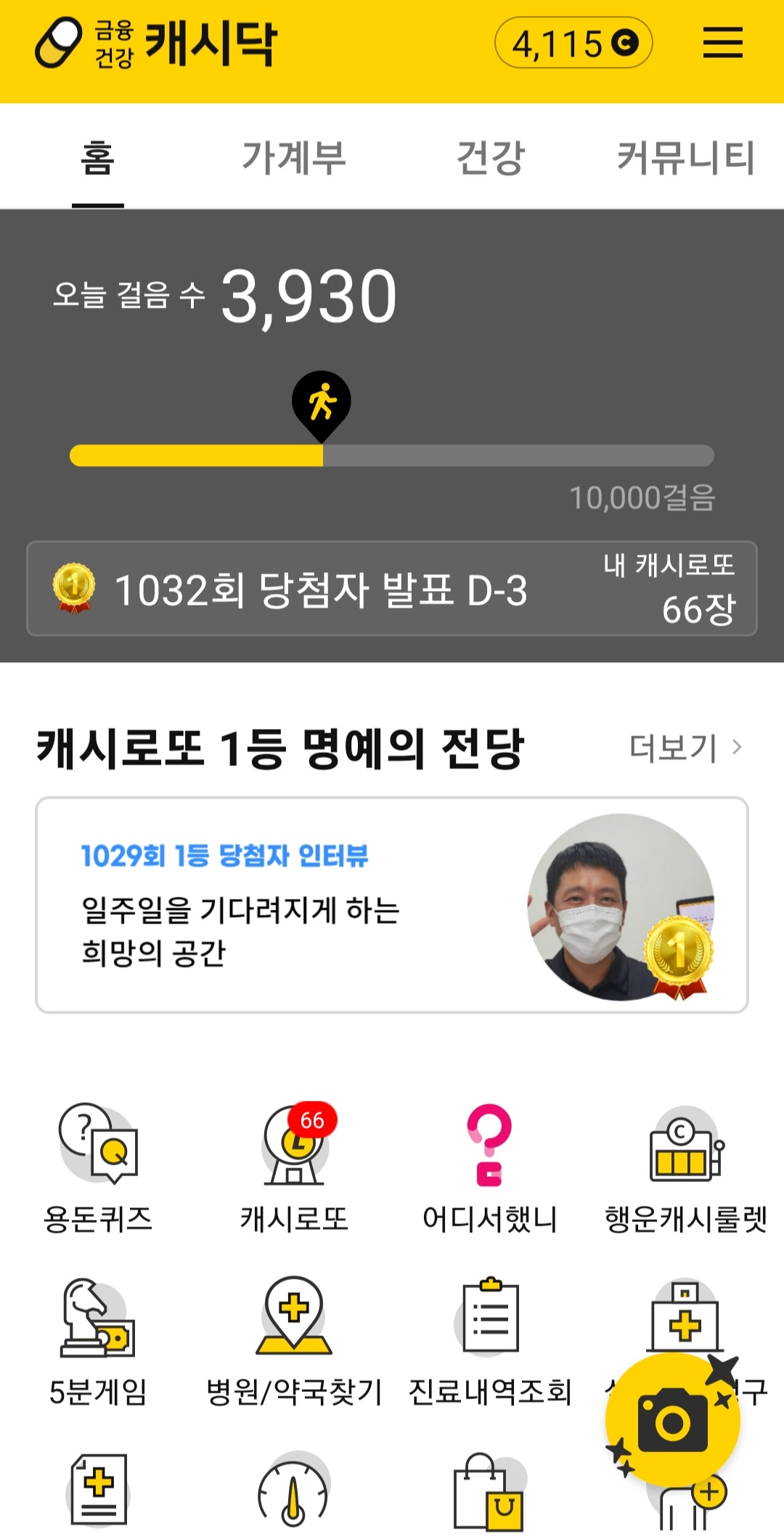 캐시워크 와 다른점은 캐시워크는 걸을때마다 걸음수가 측정되서 캐시로 적립이 가능하지만 캐시닥은 백걸음마다 캐시로또 1장씩 지급이 된다
