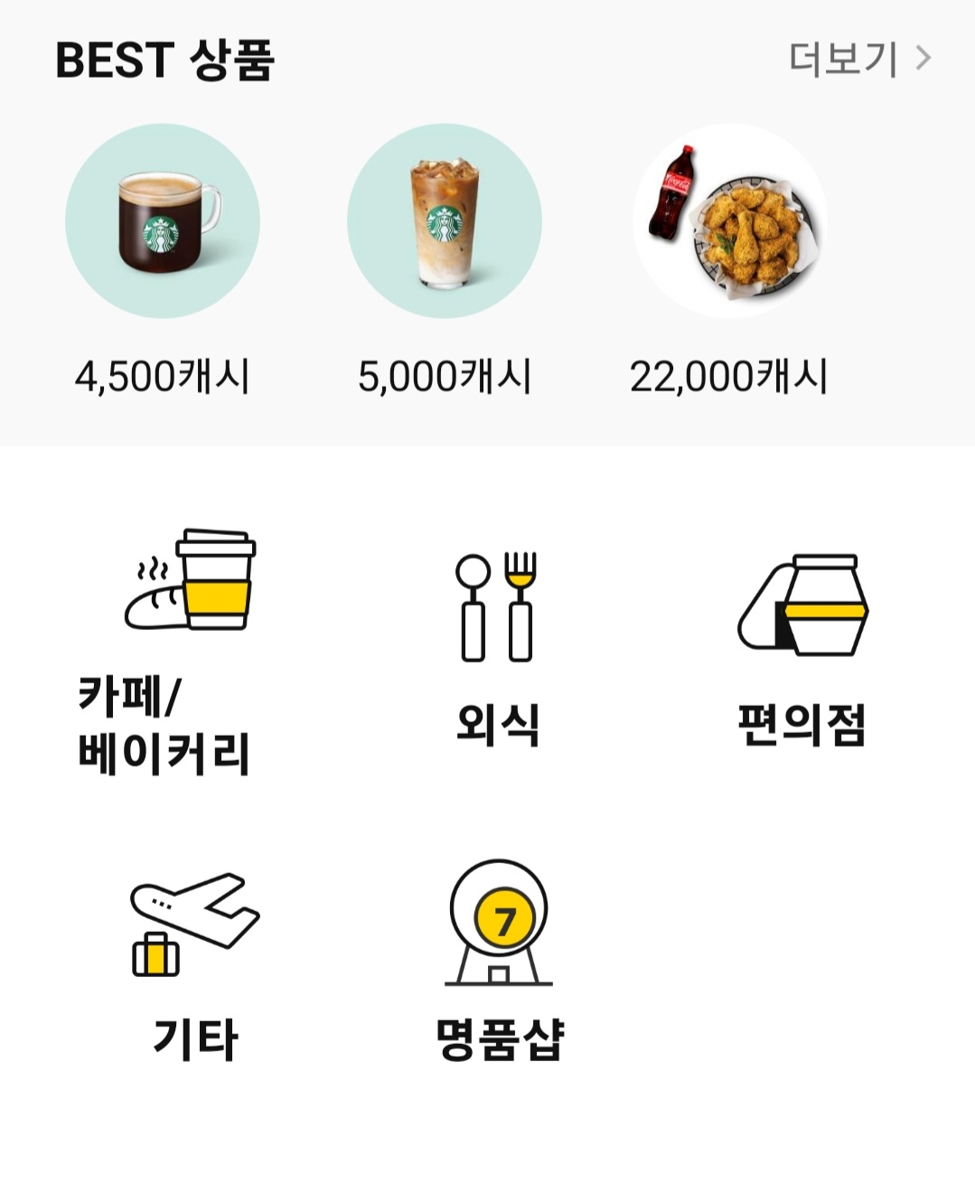 이렇게 쌓인캐시는 커피나 외식, 편의점 모바일 상품권으로 교환이 가능하다.