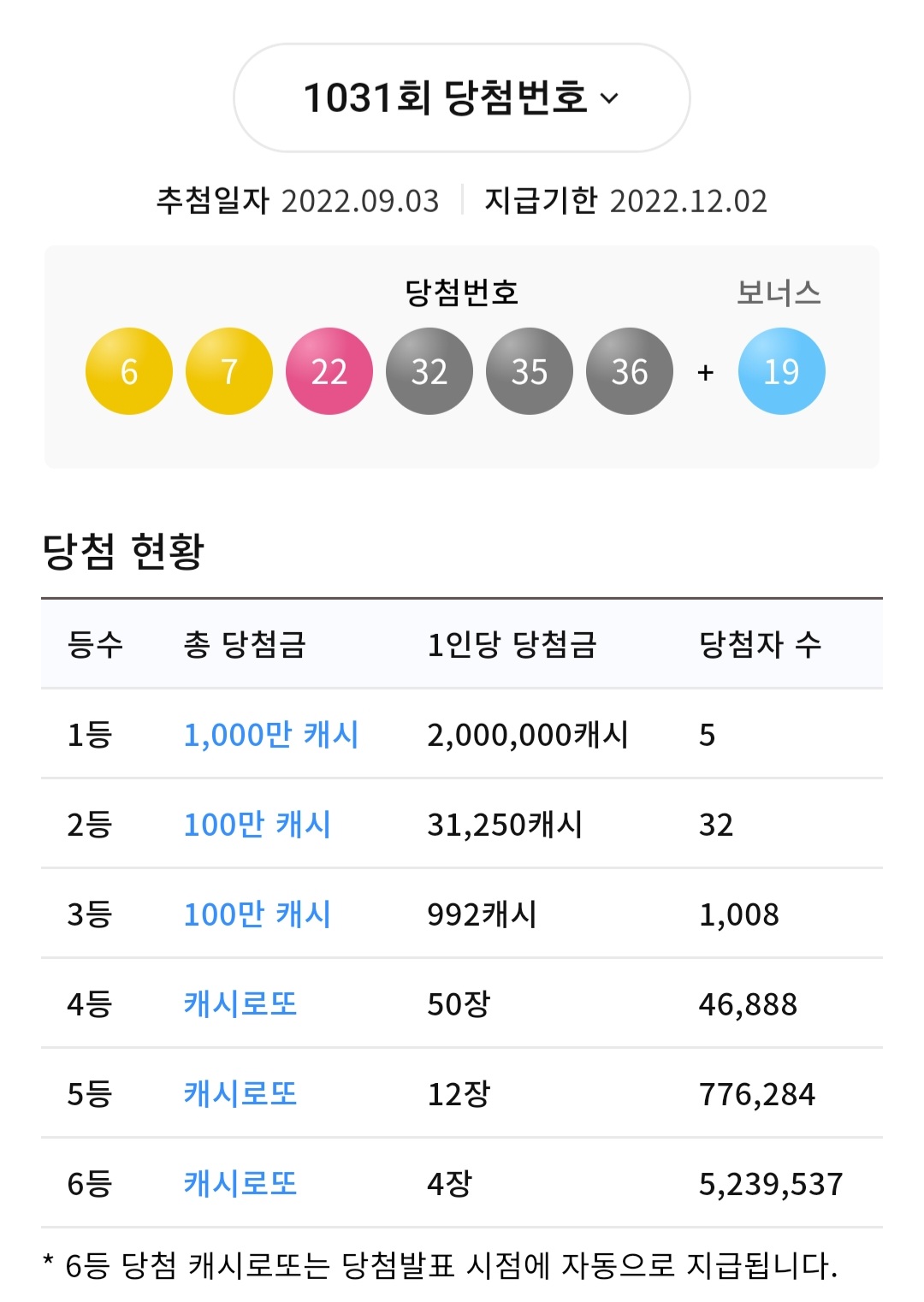 캐시닥 캐시로또는 실제 로또번호와 같다. 그동안 출석 해서 받은 캐시로또와 열심히 걸어서 받은 캐시로또가 많으면 많을수록 당첨 확률은 높아진다. 1등은 1,000 만캐시로 5명이 나누면 200캐시를 받을수있다. 이 캐시로 명품관에서 쇼핑이 가능하다