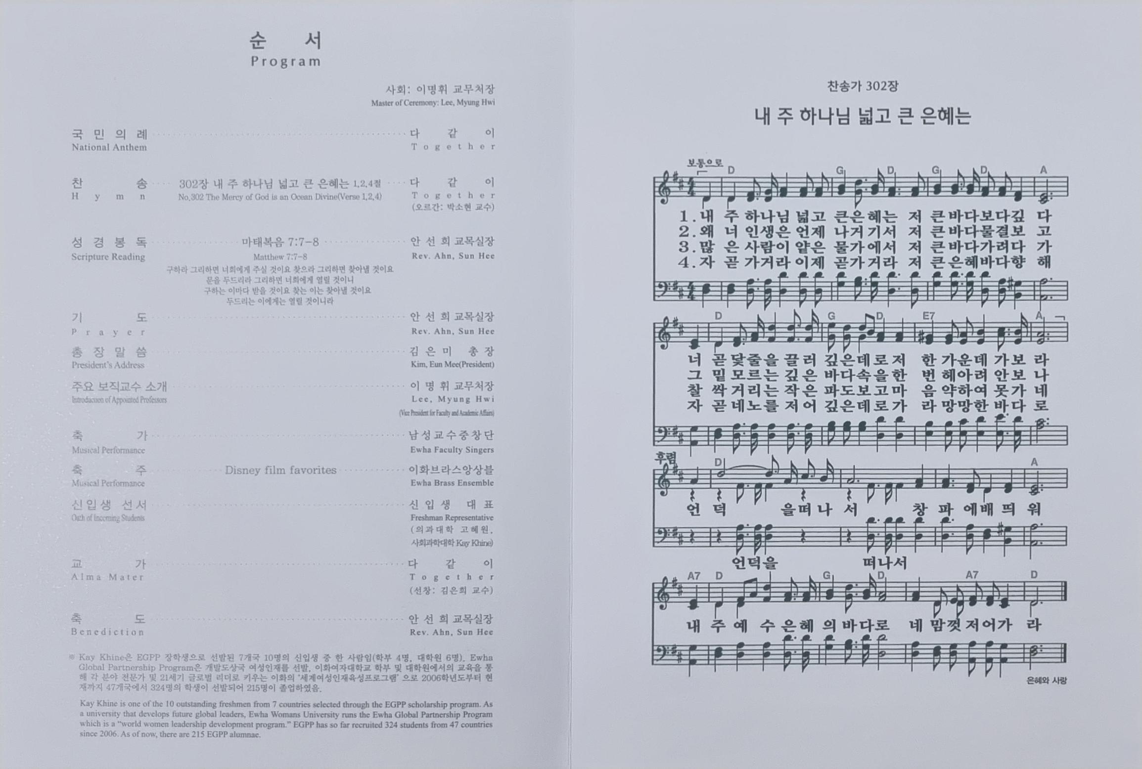 이화여자대학교는 미션스쿨이라 입학식도 예배를 드린다. 왠지 참 뭉클했다. 딸은 신촌에 있는 연세대학교를 가고 싶어했지만 신촌에 있는 학교중 연세대학교만 빼고 서강대학교, 이화여자대학교를 합격했다. 물론 입결이 높은 서강대학교가 좀 아쉽지만 과를 보고 이대를 선택했지만 사실 종교도 무시못했다(서강대는 카톨릭) 그래도 개신교인 집안으로서는 이화여자대학교 입학식이 참 좋았다.