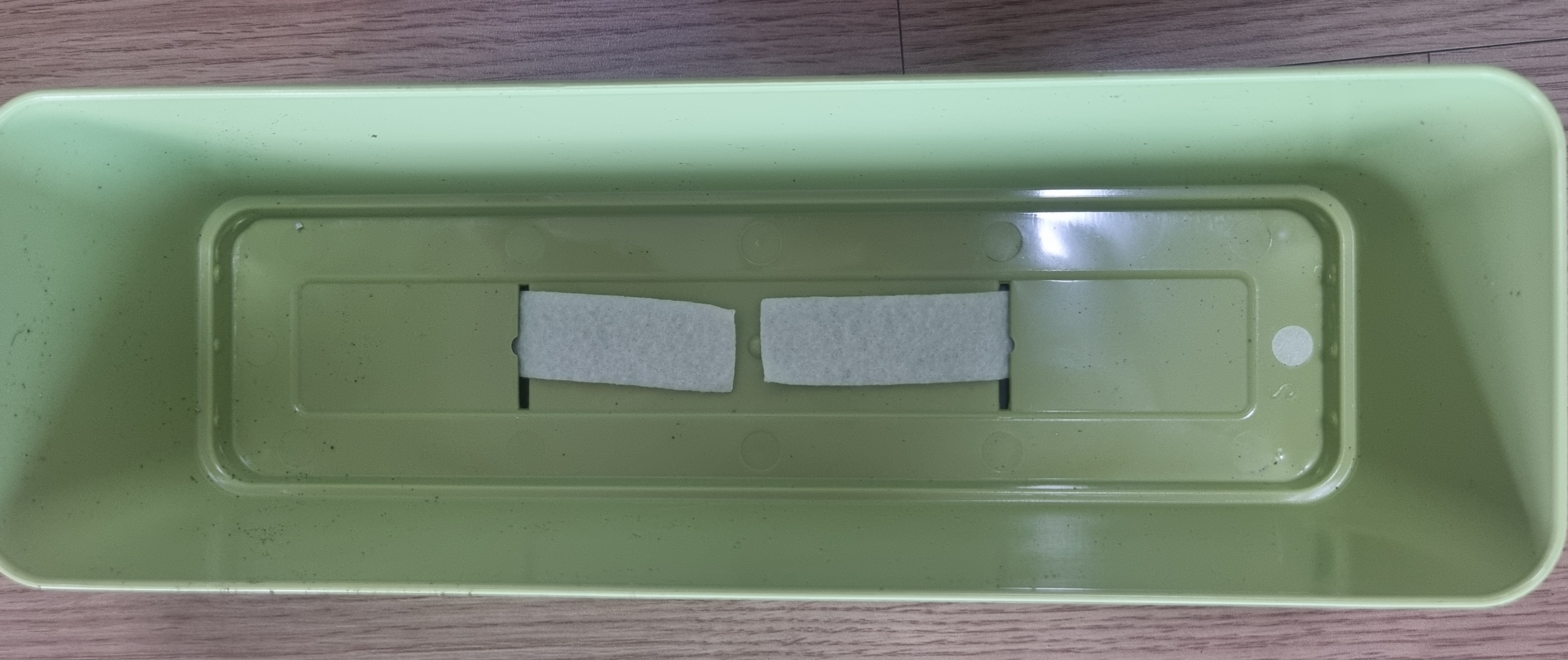 1. 화분바닥의 구멍에 부직포 끈을 끼우고 동봉된 배양토를 채워준다.