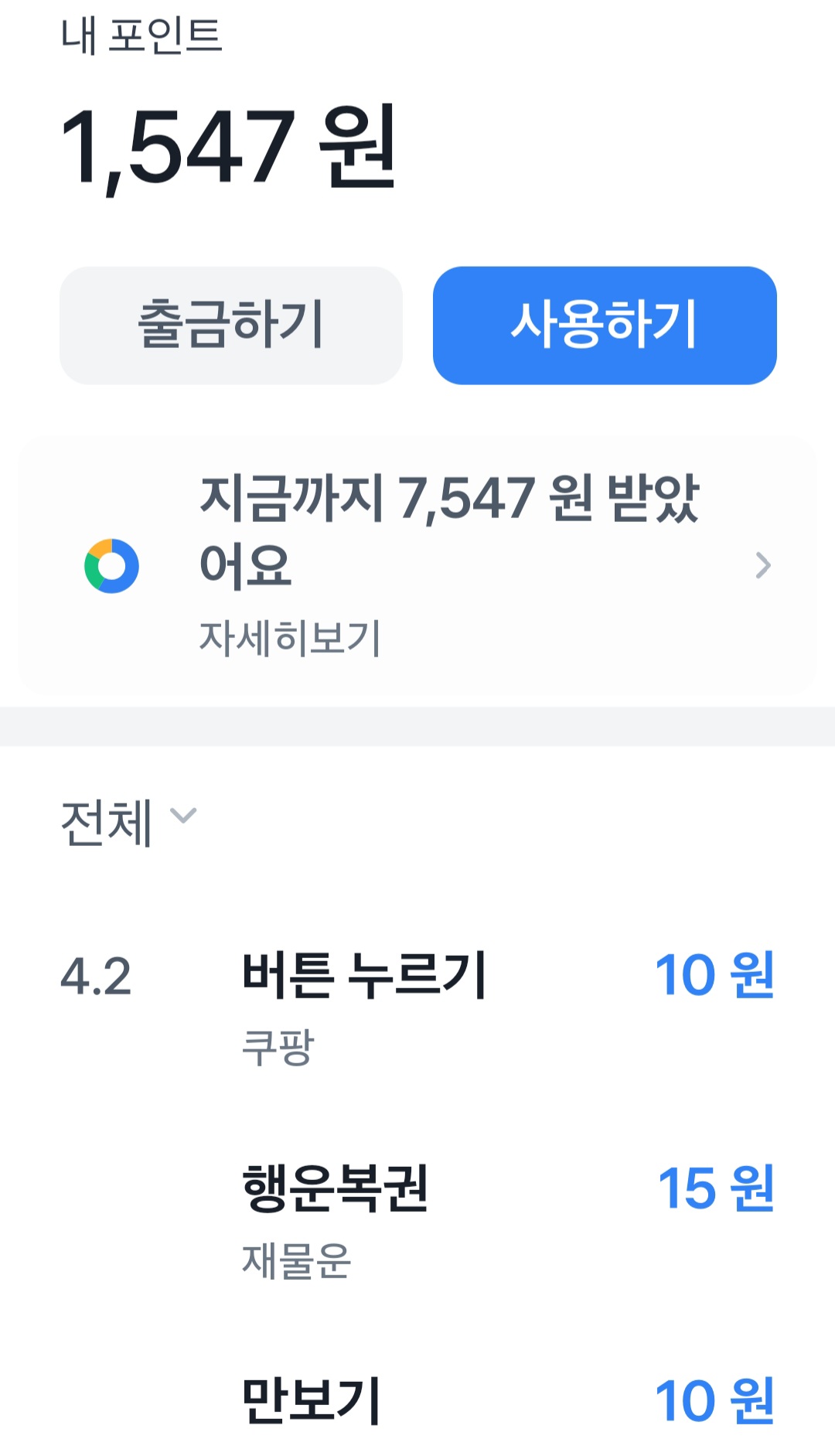 토스는 행운복권, 만보기, 광고 보기등도 포인트를 받을수 있고 이 포인트는 현금으로 출금이 가능하다.