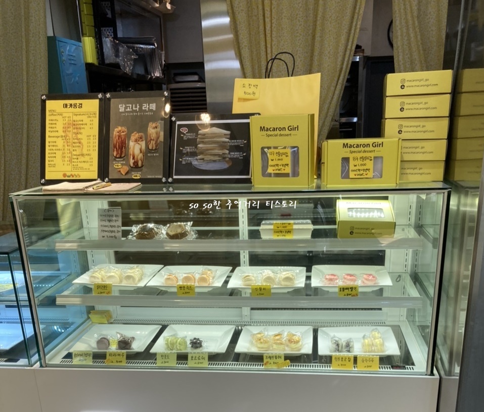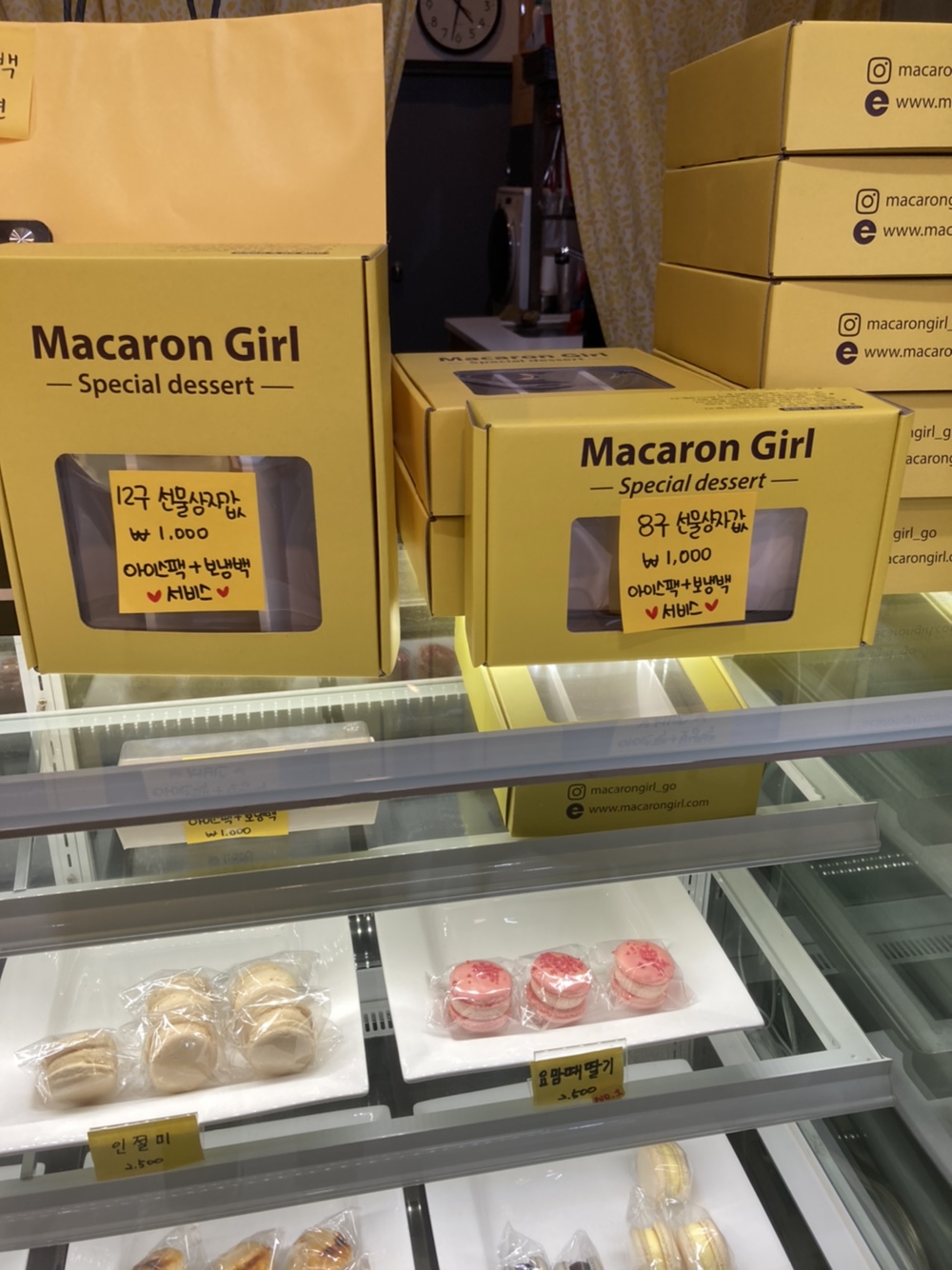 마카롱 까페 마카롱걸은 수제 마카롱이라 맛있다. 많이 달지도 않고 쫄깃하다 해야 하나 씹는 식감이 좋다. 맛은 티라미수, 청포도, 초코로쉐, 민트초코칩, 순수우유, 인절미, 요맘때 딸기, 블루베리크림치즈 등 10가지 정도 되는 맛이 있어서 취향대로 골라먹을 수 있다