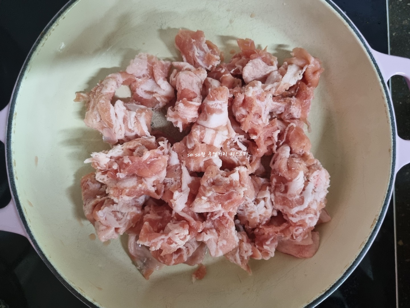 먼저 그릇에 삼겹살을 놓는다. 냉동실에 얼어 있었던거라 조금 늦게 해동을 해서 전자레인지에 조금 돌렸다. 삼겹살 양은 큰마트에 가면 큰 팩에 반정도 되는 분량이다. 저번에 한팩을 사서 반은 구워 먹고 반은 냉동실에 얼려 놓았다. 대패삼겹살은 이렇게 냄비 바닥에 깔아놓는다.