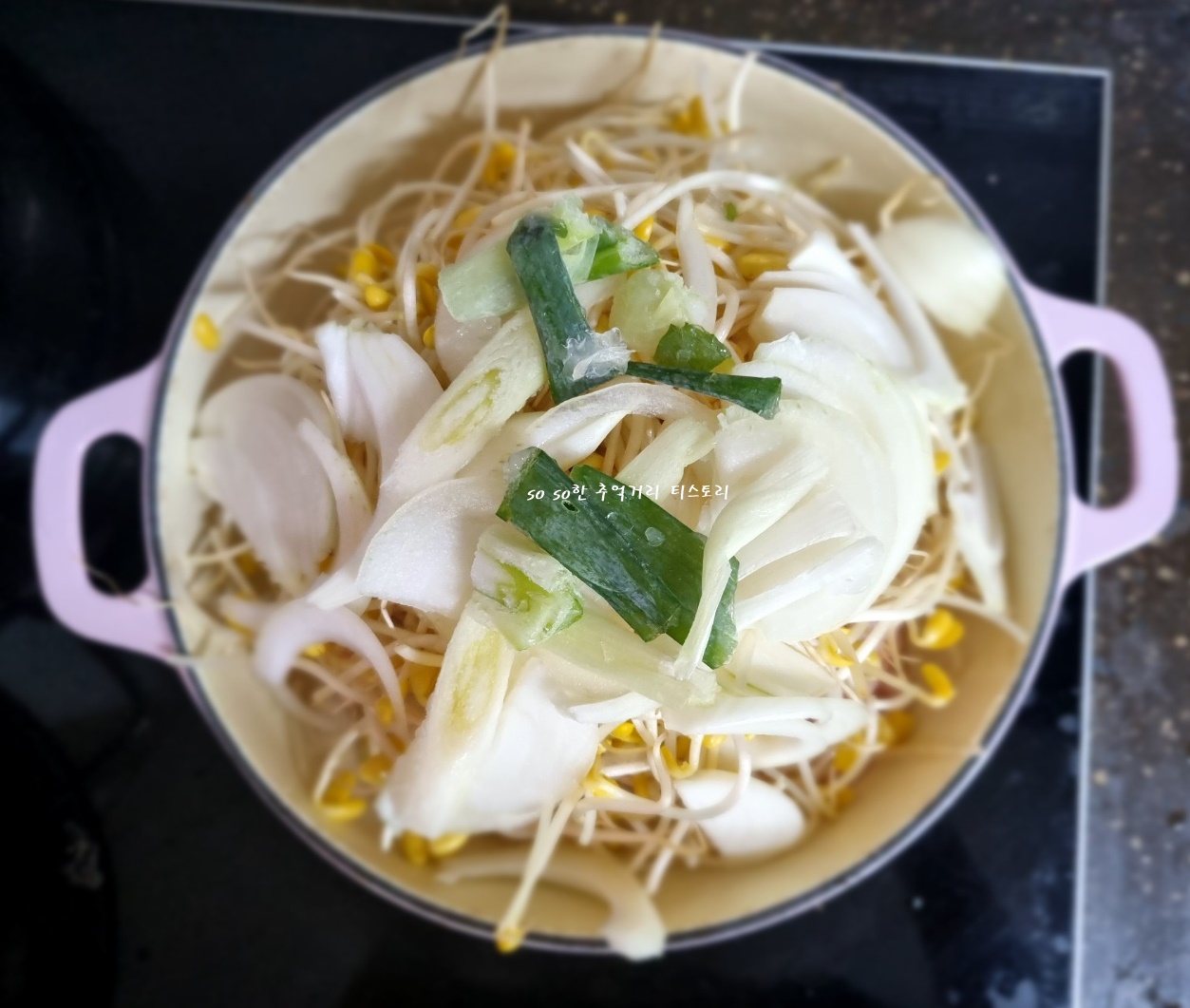 그리고 대패삼겹살 위에 씻은 콩나물 1봉지를 올려 놓는다. 양파는 중 정도 되는 크기 반만 넣었다.