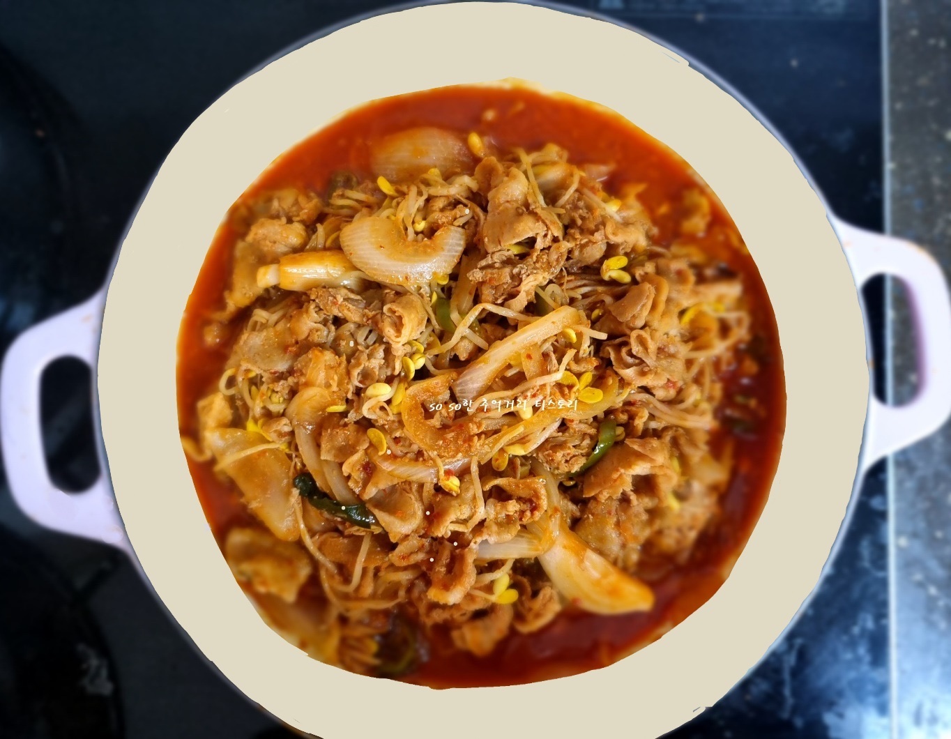 다 완성된 음식이 된다. 요리를 하다보니 냄비 옆에 지저분한 양념이 넘 많이 묻어서 옆에는 보정을 좀 했다. 비주얼이 좀 아니라.... 식구들이 간도 잘 맞다고 한다. 아삭한 식감이 좋은 콩나물이 풍미를 더해준다. 좀 부족하다 싶으면 남은 국물에 밥을 비벼 먹어도 좋다. 백종원 레시피 콩나물 불고기는 재료만 있음 정말 간단한 음식이다. 난 점심으로 먹었지만 저녁메뉴로도 추천하고 손님 대접용으로도 꽤 좋은 음식이다.