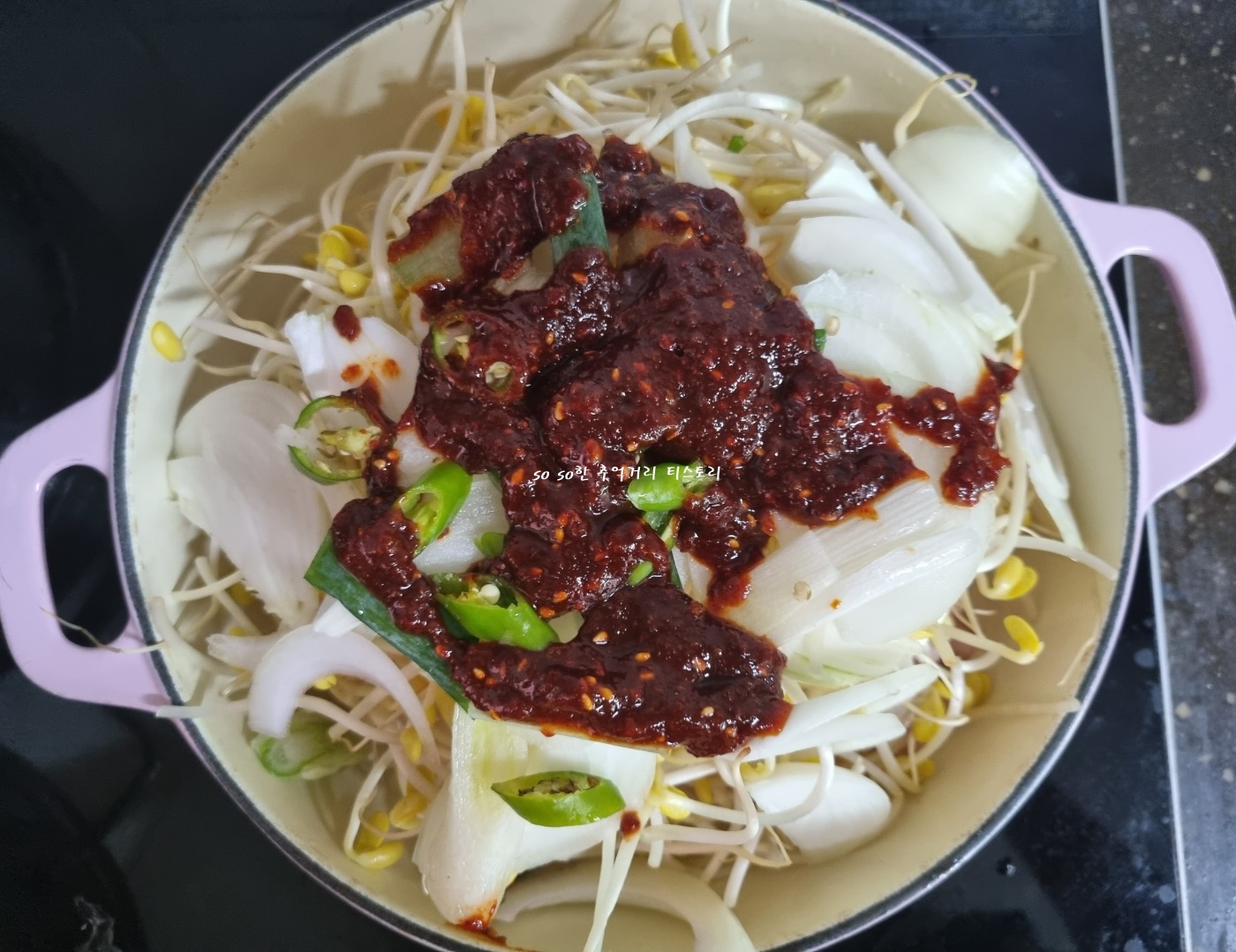 그리고 만든 양념장을 가장 위에 부어 주면 된다. 양념장에 매운거를 못 드시는 분들은 고춧가루를 1숟가락 반만 해도 간이 잘 맞다. 설탕도 식성에 따라 가감한다. 처음 불을 중불 정도에 맞추면 콩나물에서 물이 나온다. 그런후에는 양념장이 고기나 콩나물에 잘 베이도록 섞는다.