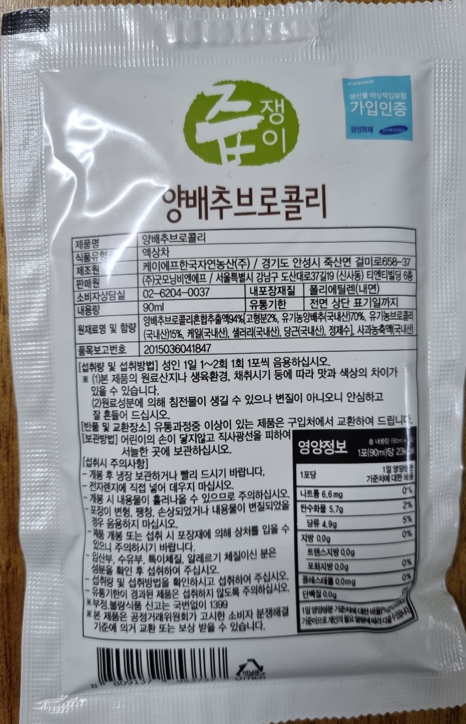 즙쟁이 양배추브로콜리는 국내산 양배추와, 브로콜리, 사과 까지 들어간 제품이라 조금 믿음이 갔다. 1박스에 30포가 들어 있는데 2박스를 주문했다. 가격은 2만원대 초반이니 1포당 400원이 안되는 꼴이다. 요즈음 웬만한 음료수도 천원이상인데 이정도는 나의 몸을 위해 투자하는 건 아깝지 않다.