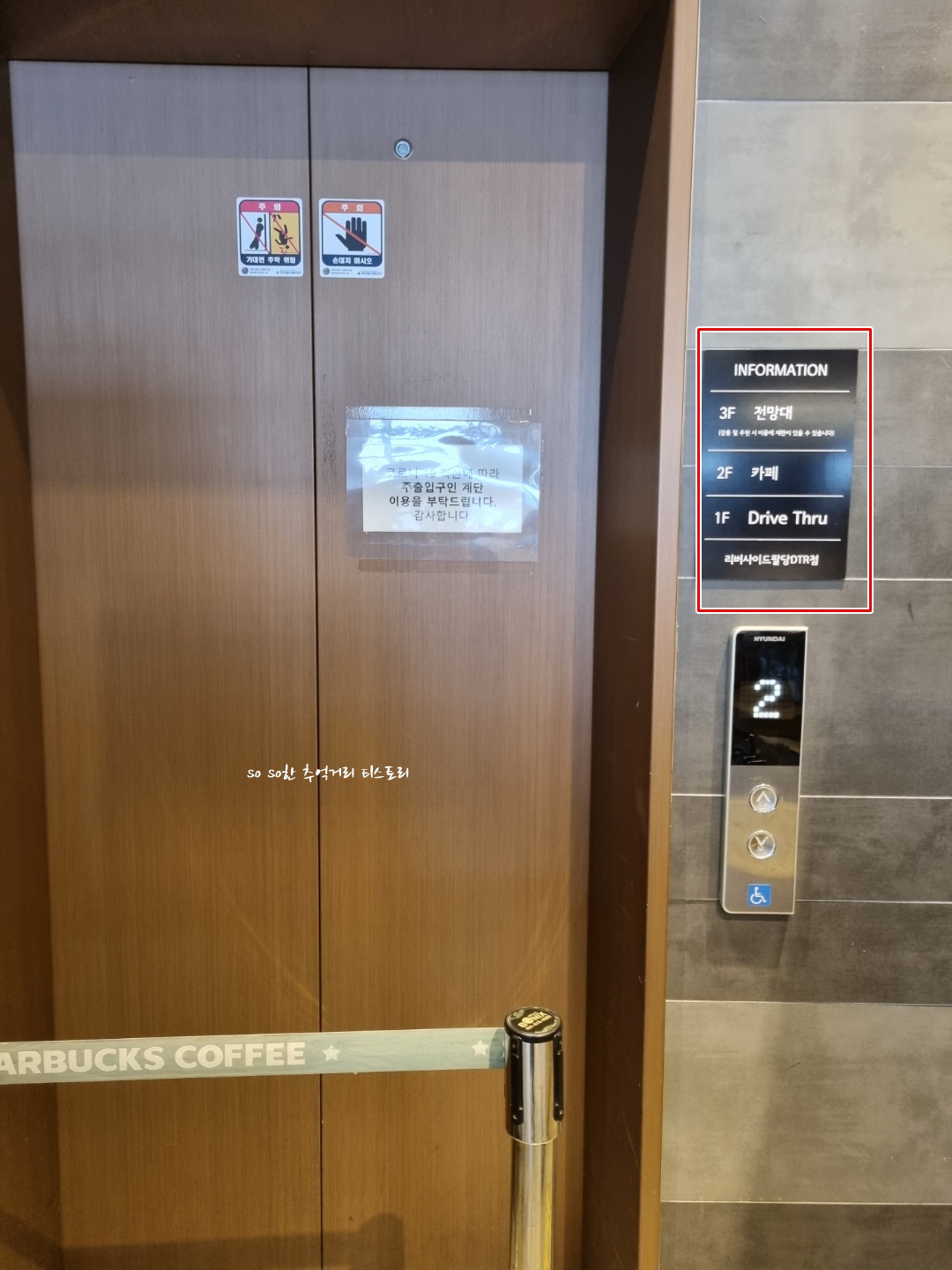 원래는 이렇게 1층에서 부터 올라오는 엘리베이터가 있었다. 하지만 코로나로 인해 멈춘 상태이다. 1층에는 드라이브스루가 있다. 2층에는 까페, 3층에는 옥외까페 전망대가 있다. 우리는 2층이 꽉 차고 사람도 많아서 3층 옥외까페 전망대로 향했다.