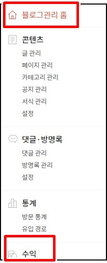그럼 신청해보자. 먼저 블로그관리 홈에 보면 수익란이 있다. 이곳에서 애드센스, 카카오 애드핏 등 내 티스토리 블로그와 연동해서 수익을 얻을 수 있다.